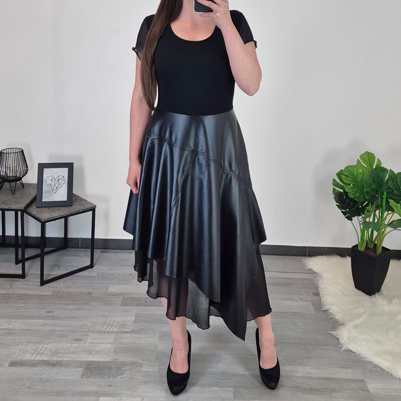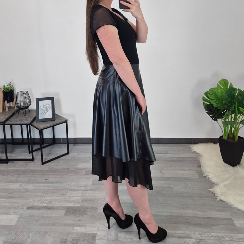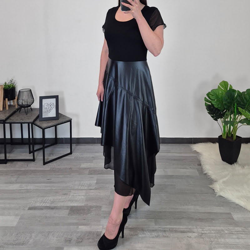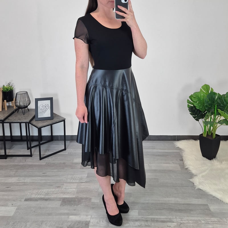 Ženska obleka Kolja v črni barvi. Obleka je asimetričnega kroja, v prsih je oprijeta, spodaj pa je krojena navzven. Kombinirana je z umetnim usnjem in črnim tilom. Obleka ima kratka rokava, ki so izdelana iz črnega tila. Izdelana je iz kvalitetne viskoze in je v kombinaciji umetnega usnja in črnega tila zelo akratktivnega videza. Na voljo je od številke 36 do 44.