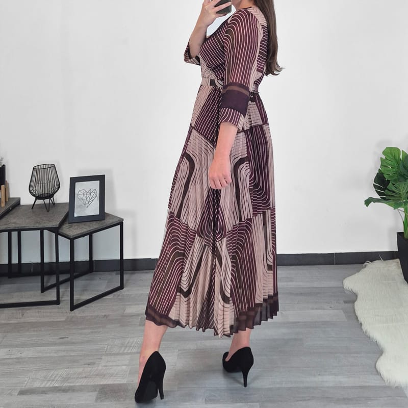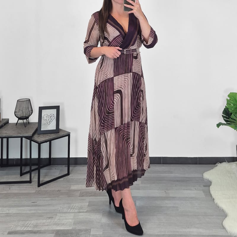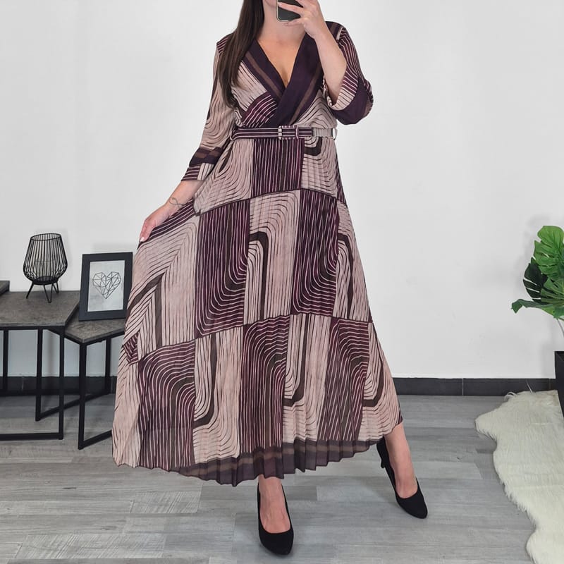 Dolga ženska obleka. Obleka je izdelana iz prosojno vzorčastega blaga iz bež, bordo in rjave barve. Pod obleko je viskozna podloga, ki sega do kolen. Rokava so dolga in prosojna. V pasu ima elastiko, zato se bilo obleka lepo prilegala vaši postavi. Priložen je tudi pas. Velikost je univerzalna, od S do L.