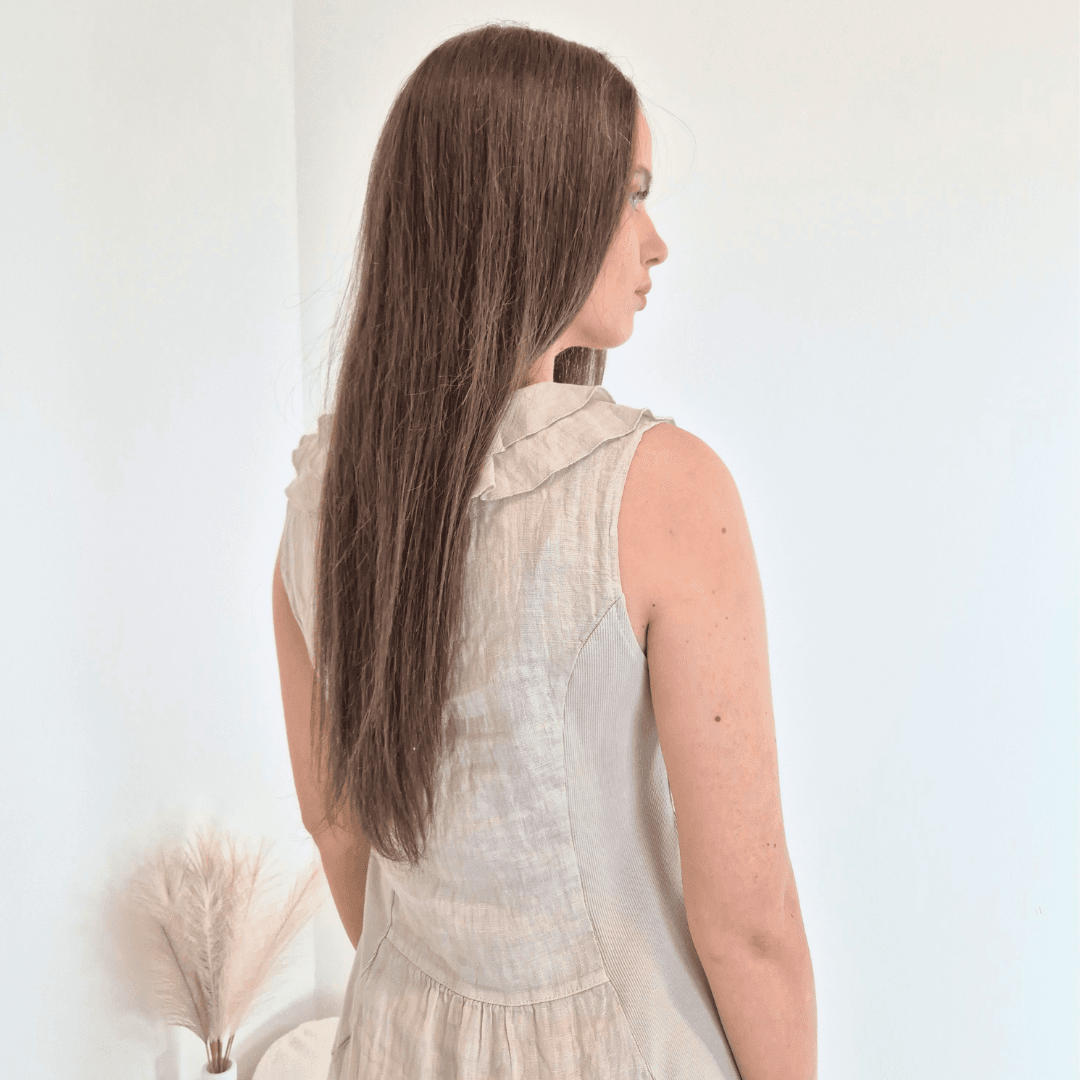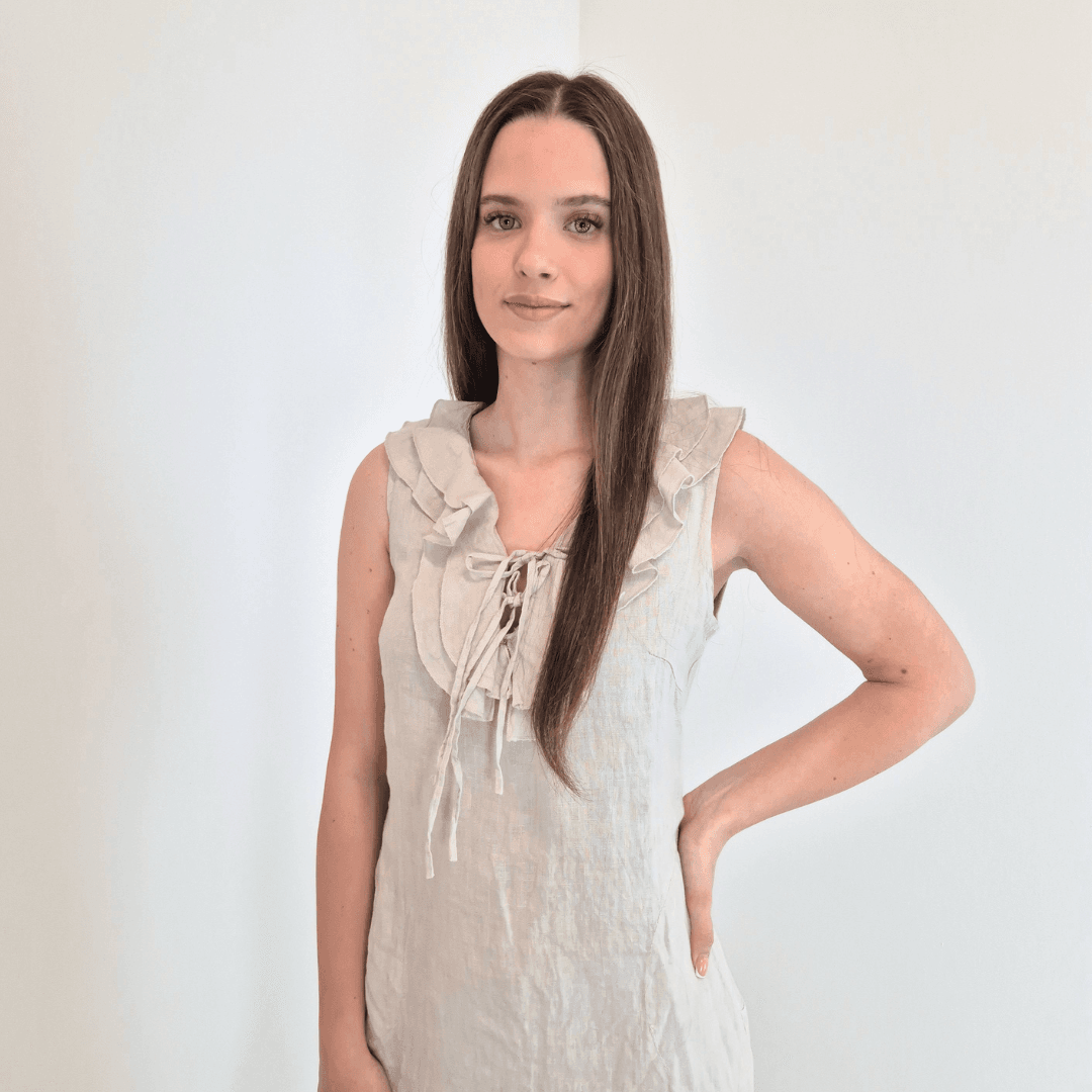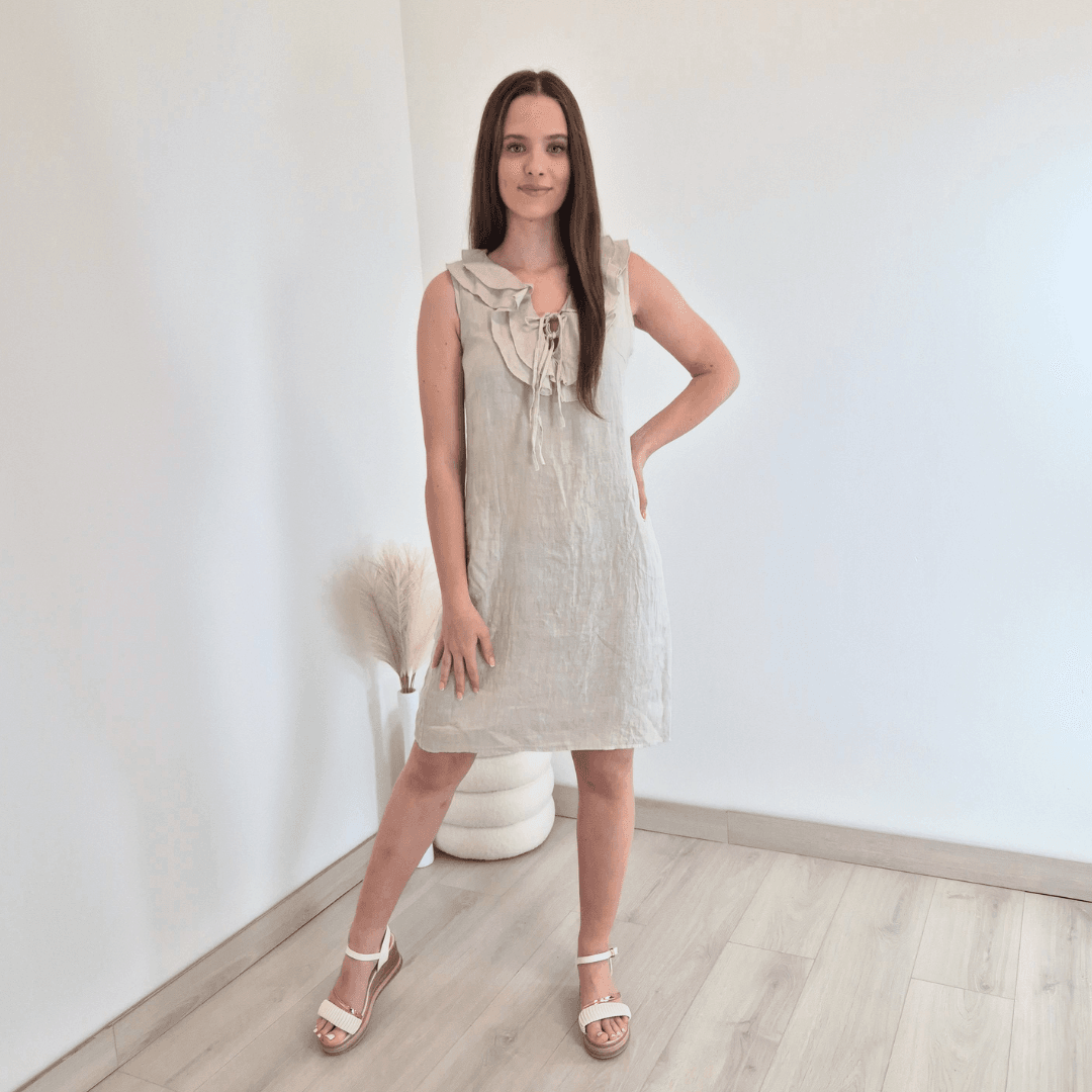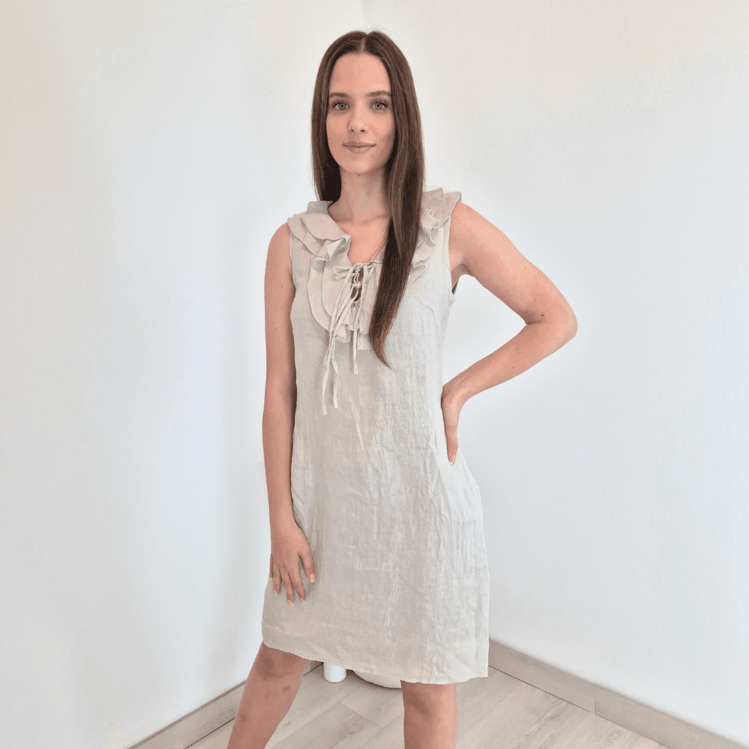 Modna ženska obleka iz kolekcije Lanna v bež barvi. Obleka je brez rokav in ima dva stranska žepa. Ob ovratniku jo krasijo volančki. Izdelana je iz 100% lanu, zato je odlična za vroče dni. Vse kose iz kolekcije Lanna lahko med sabo lepo kombinirate.