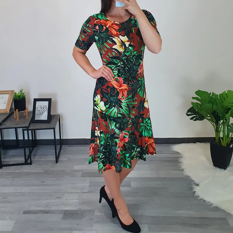 Ženska poletna obleka Vela s pisanim vzorcem. Obleka ima kratka rokava, v predelu prsi je bolj oprijeta, nato pa krojena navzven. Izdelana je iz kvalitetne viskoze, je lahka in zračna. Krilo sega čez kolena. Vzorci na obleki so lahko razporejeni drugače kot na sliki.
