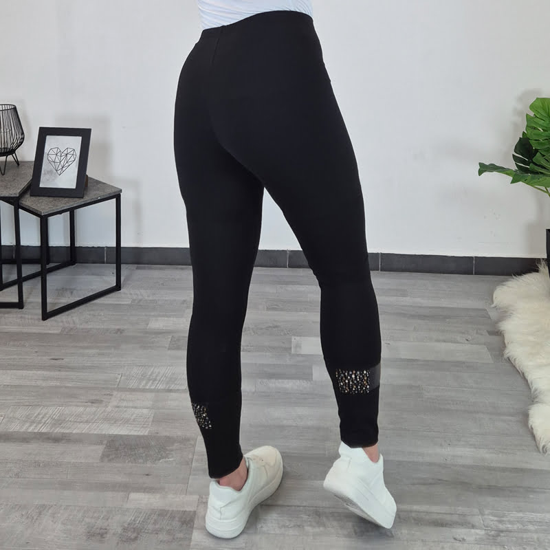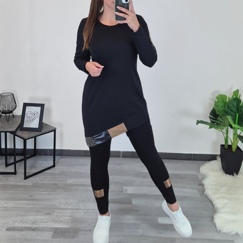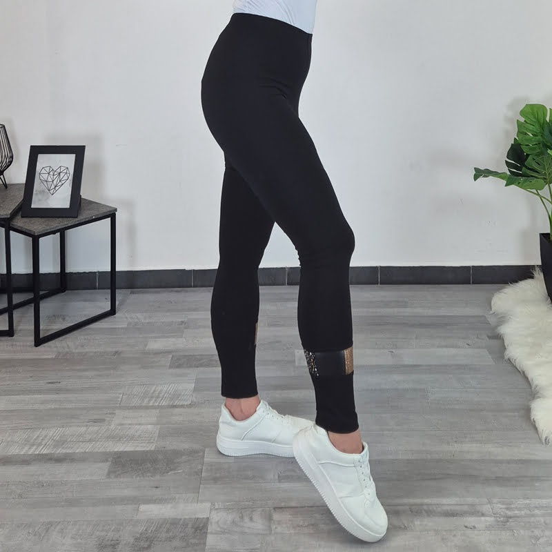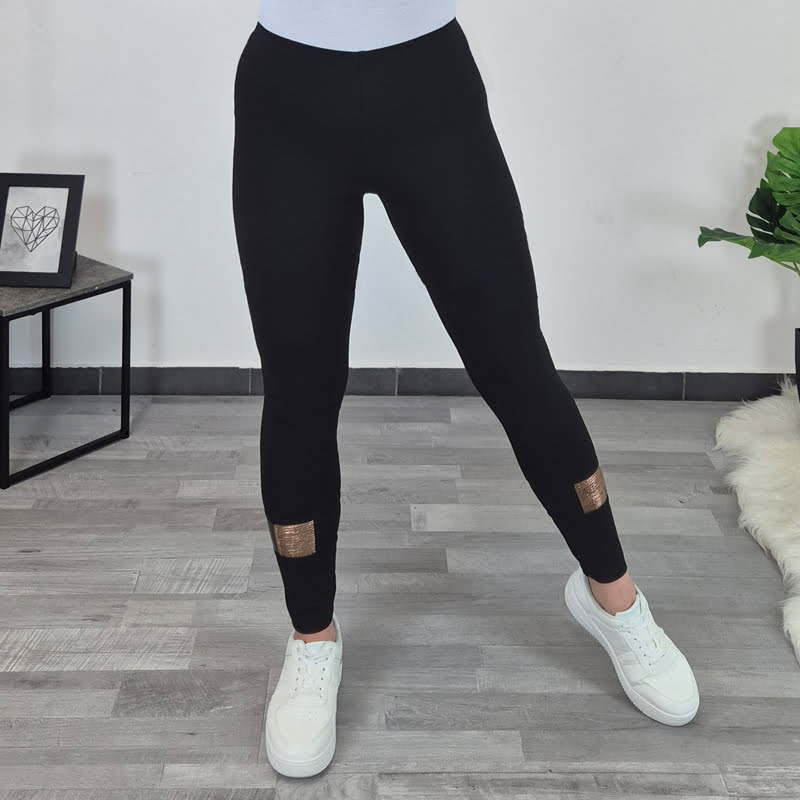 Ženske dolge pajkice Felici so izdelane iz kvalitetnega bombaža. Pajkice so v črni barvi, na spodnjem delu hlačnic je dodano blago v zlati barvi, v imitaciji usnja in pikic.