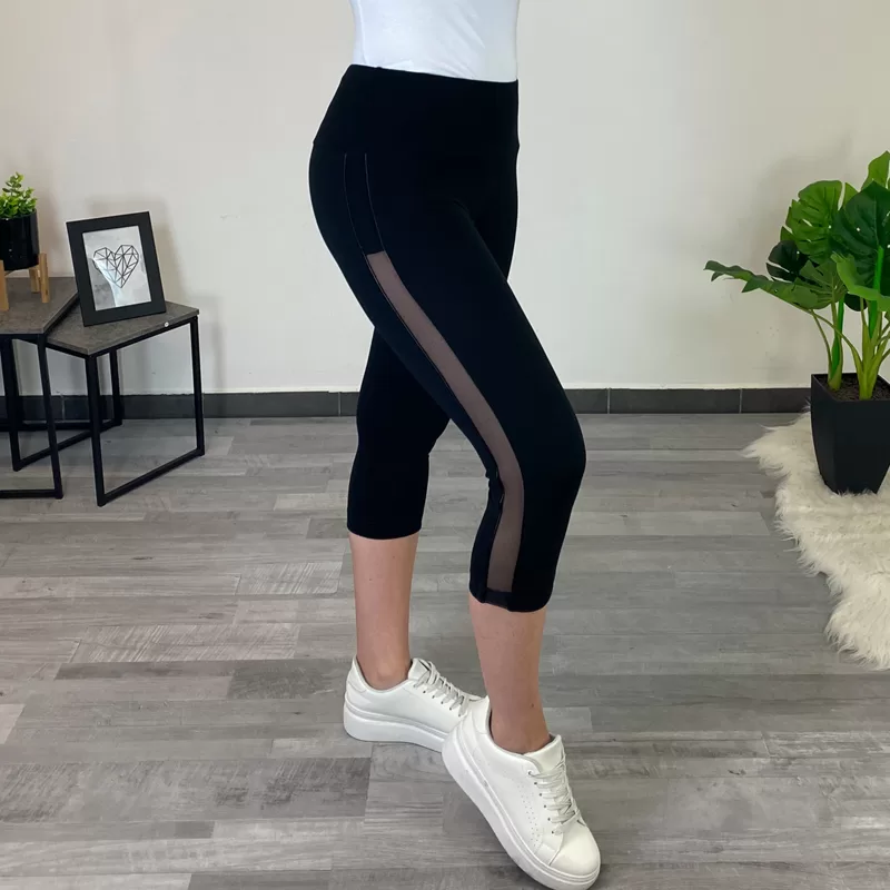 Ženske pajkice Ria v črni barvi. Pajkice imajo višji pas, ki se zaključuje s širokim patentom, v pasu pa imajo ozko elastiko. Hlačnice so ozke in dolžine 3/4. Ob strani imajo dodan črn til in obrobo v imitaciji usnja, kar pajkicam daje posebno atraktiven izgled. Izdelane so iz kvalitetne mešanice bombaža in elastana in so prijetne za nošenje. Na voljo so od velikost 36 do 50.