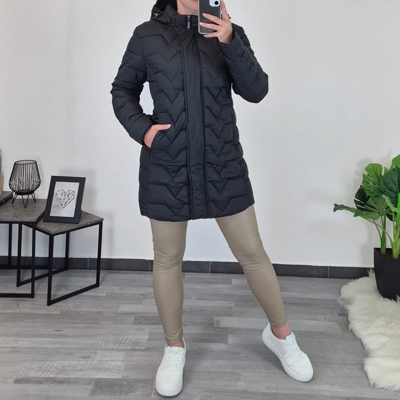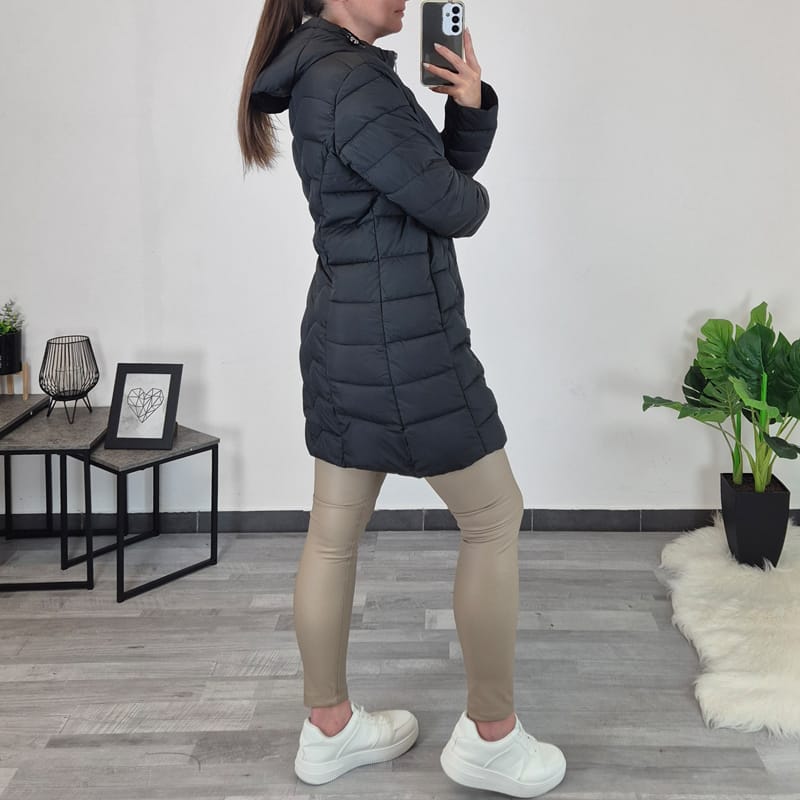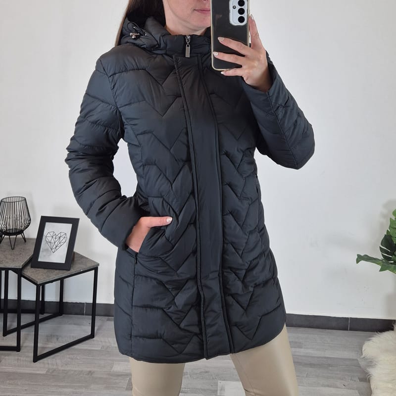 Ženski tanjši plašč s kapuco. Plašč je prešit in je v črni barvi. Plašč se po celotni dolžini zapenja s črno zadrgo in z gumbi, prav tako se z zadrgo zapenjata oba stranska žepa. Plašč ima visok ovratnik in kapuco, kapuca je snemljiva. Na voljo je od velikosti 42 do 50.