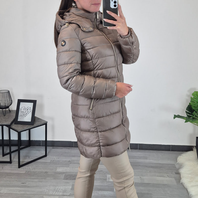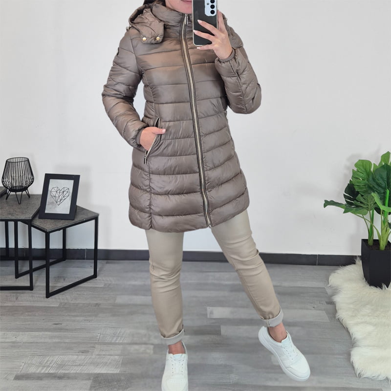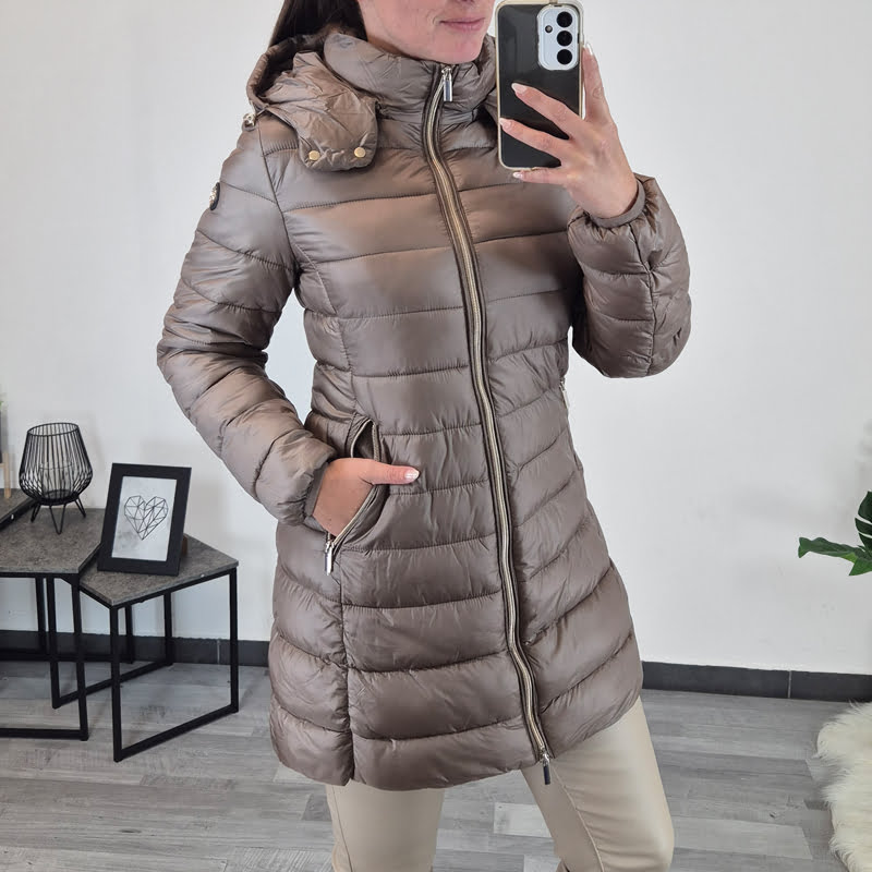 Ženski tanjši plašč s kapuco. Plašč je prešit in je v rjavi barvi. Plašč se po celotni dolžini zapenja z zlato zadrgo, prav tako se z zadrgo zapenjata oba stranska žepa. Plašč ima visok ovratnik in kapuco, kapuca je snemljiva. Na voljo je od velikosti S do XXL.