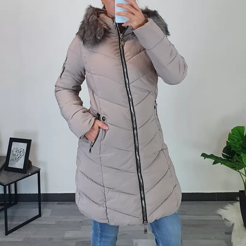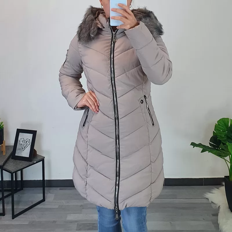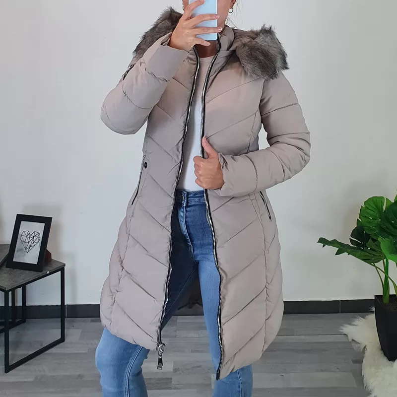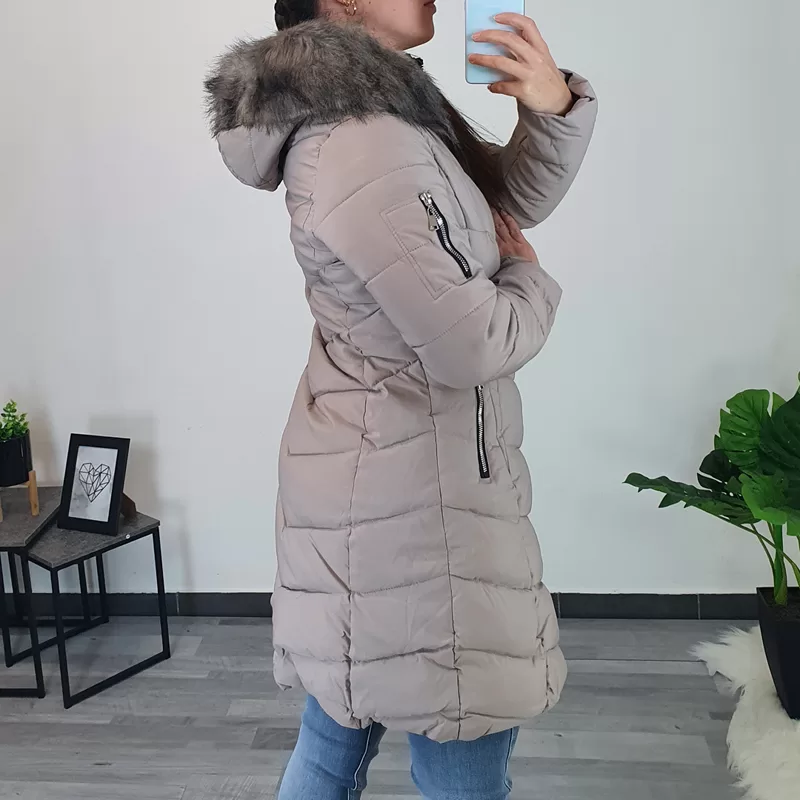 Ženski prešiti plašč v bež barvi. Plašč ima dodano kapuco z bogatim umetnim krznom v bež barvi, tako kapuca kot tudi krzno se lahko ločeno snameta. Plašč se po celotni dolžini zapenja s srebrno zadrgo, prav tako se z zadrgo zapenjata tudi stranska žepa. Ob žepih je dodan črn net, ki plašču da poseben videz. Plašč je odličnega ženskega kroja, teliran in se lepo prilega telesu. Na voljo od velikosti S do XXL.