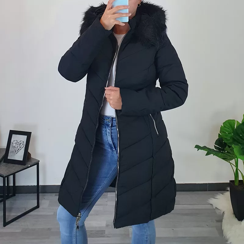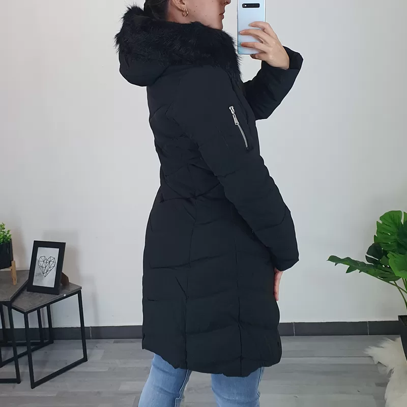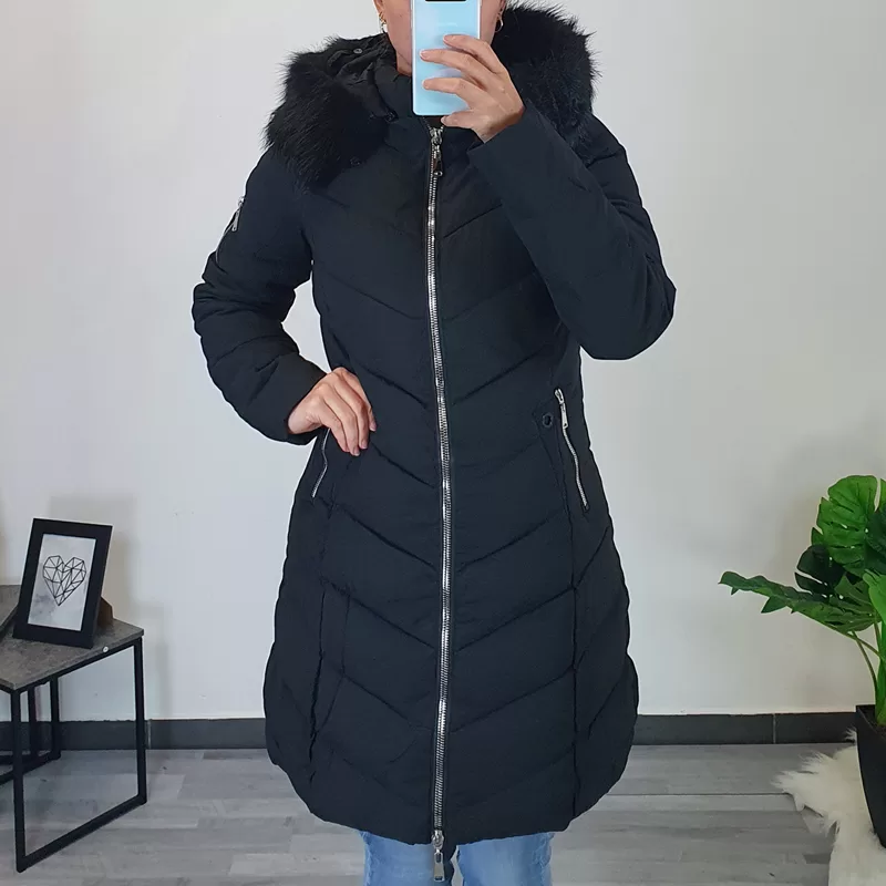 Ženski prešiti plašč v črni barvi. Plašč ima dodano kapuco z bogatim umetnim krznom v črni barvi, tako kapuca kot tudi krzno se lahko ločeno snameta. Plašč se po celotni dolžini zapenja s srebrno zadrgo, prav tako se z zadrgo zapenjata tudi stranska žepa. Ob žepih je dodan črn net, ki plašču da poseben videz. Plašč je odličnega ženskega kroja, teliran in se lepo prilega telesu. Na voljo od velikosti S do XXL.