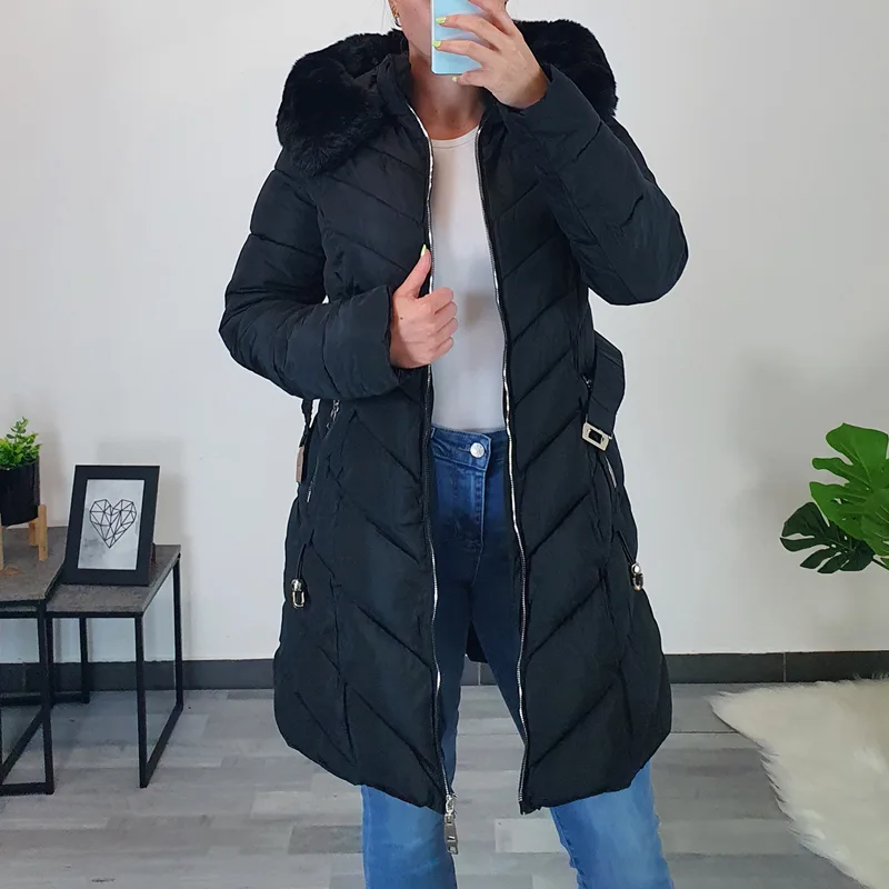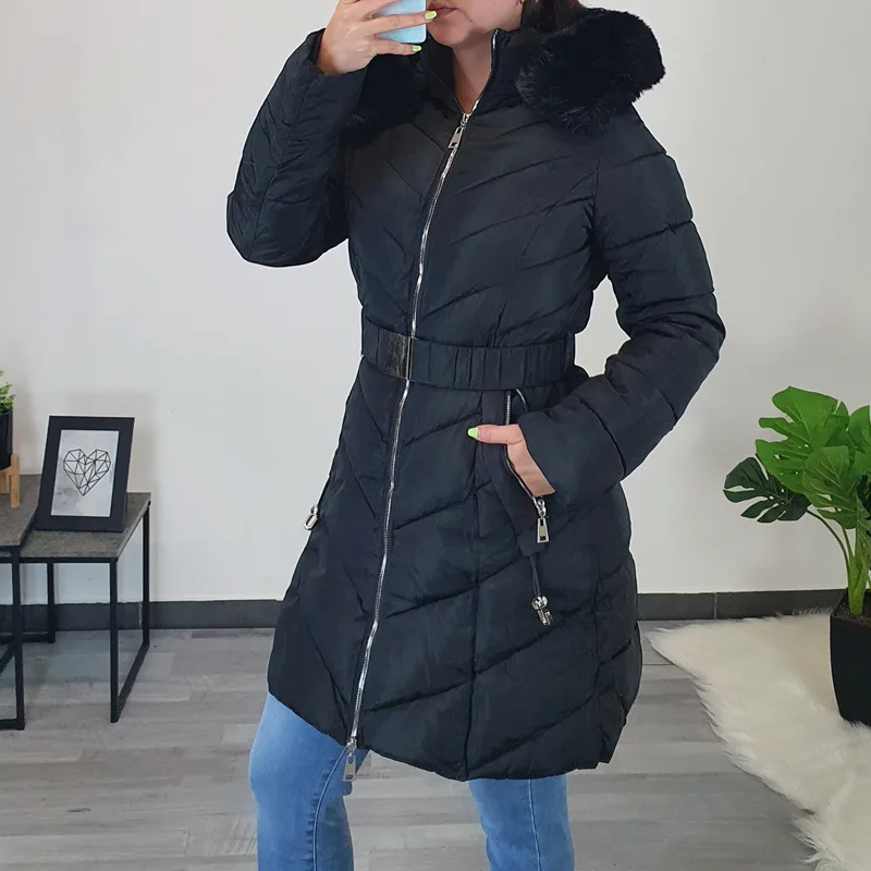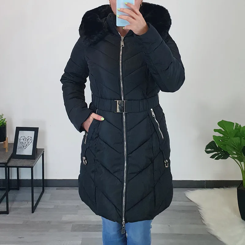 Ženski prešiti plašč v črni barvi. Plašč ima dodano kapuco z bogatim umetnim krznom v črni barvi, tako kapuca kot tudi krzno se lahko ločeno snameta. Plašč se po celotni dolžini zapenja s srebrno zadrgo, prav tako se z zadrgo zapenjata tudi stranska žepa. Plašč je odličnega ženskega kroja, teliran in se lepo prilega telesu, zraven je še pas s katerim dodatno oblikujete model. Na voljo od velikosti S do XXL.