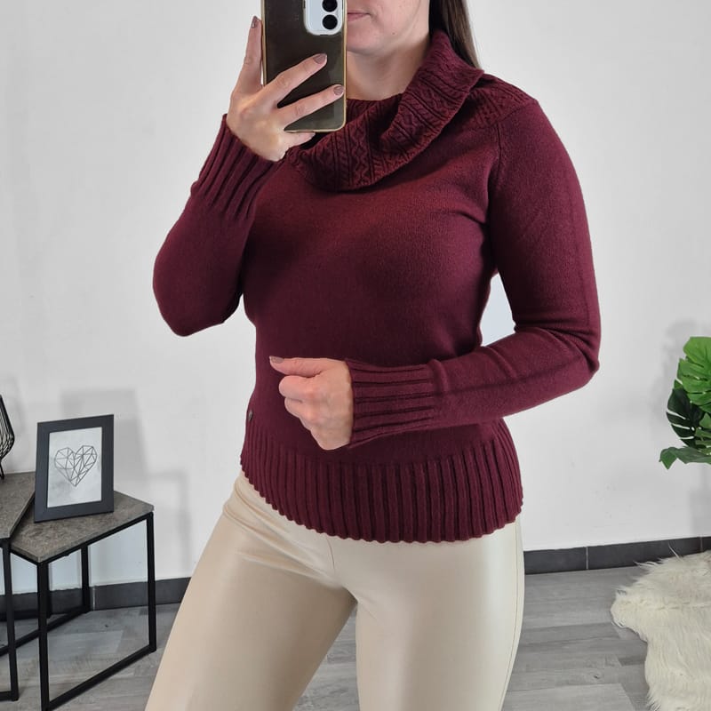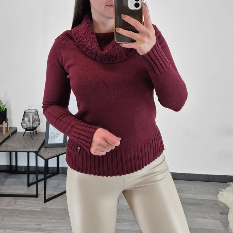 Modna ženska pletenina v bordo barvi. Pletenina ima dolga rokava, ovratnik je širok in spuščen, krasi ga čudovit vzorec. Izdelana je iz zelo mehkega in elastičnega materiala. Velikost je univerzalna, primerna za S do L.