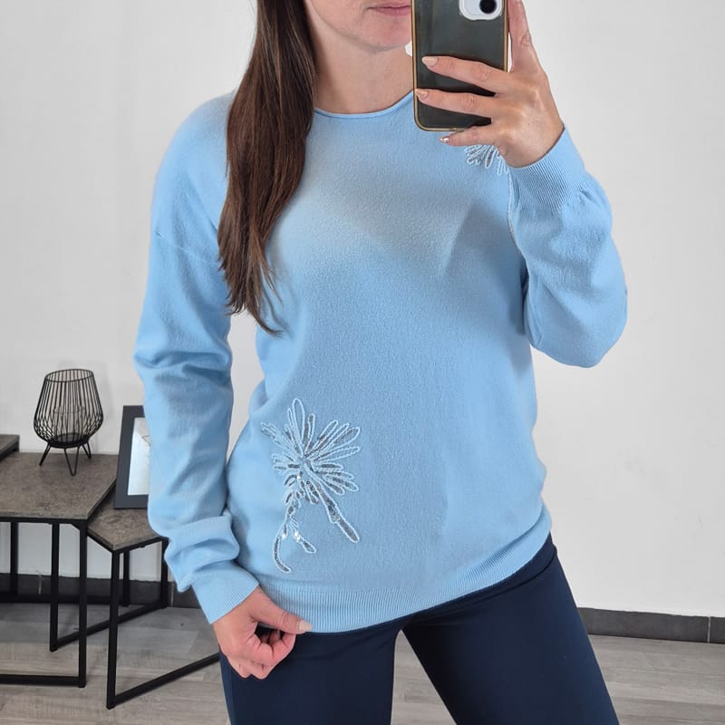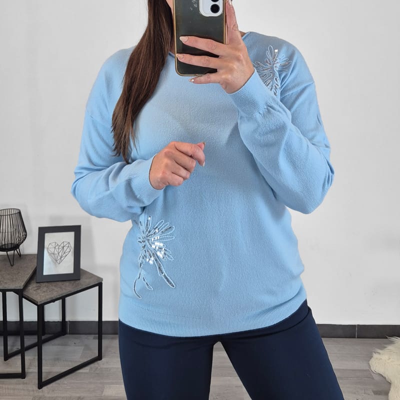Ženska tanjša pletenina, primerna za hladnejše dni. Majica ima okrogel izrez, na otip je zelo mehka in je prijetna za nošenje. Ima dolga rokava in je v svetlo modri barvi. Na sprednji strani ima prišite manjše bleščice v obliki rože, kar daje puloverju poseben izgled.