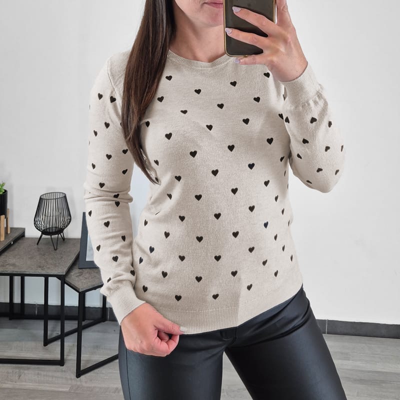 Ženska tanjša pletenina, primerna za hladnejše dni. Majica ima okrogel izrez in dolga rokava. Izdelana je iz mešanice viskoze, zato je na otip zelo mehka in prijetna za nošenje. Je v sivo – bež barvi, krasi jo tisk črnih srčkov. Velikost je univerzalna, primerna za S do L.