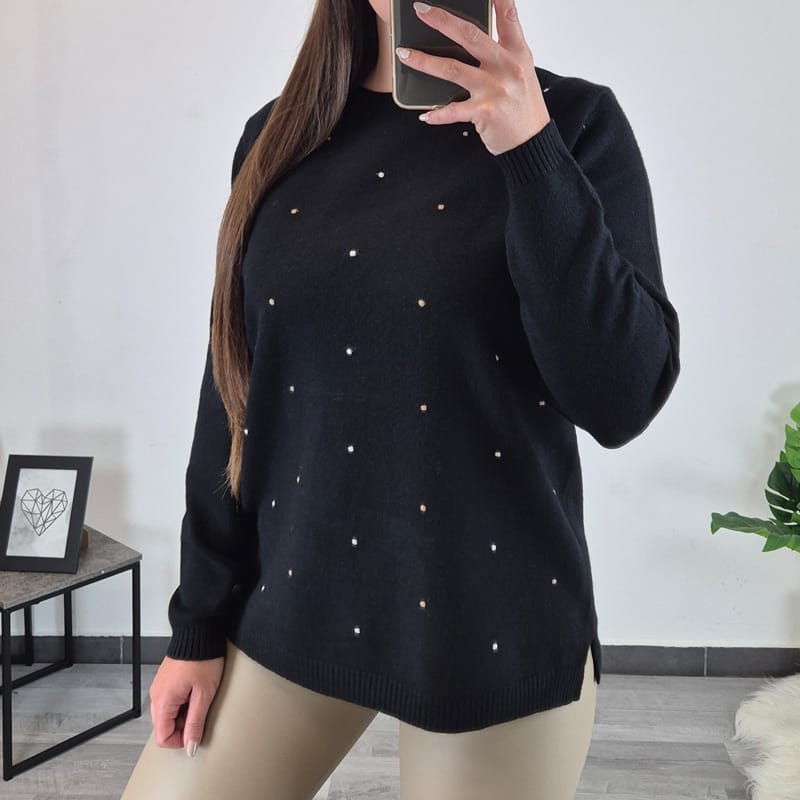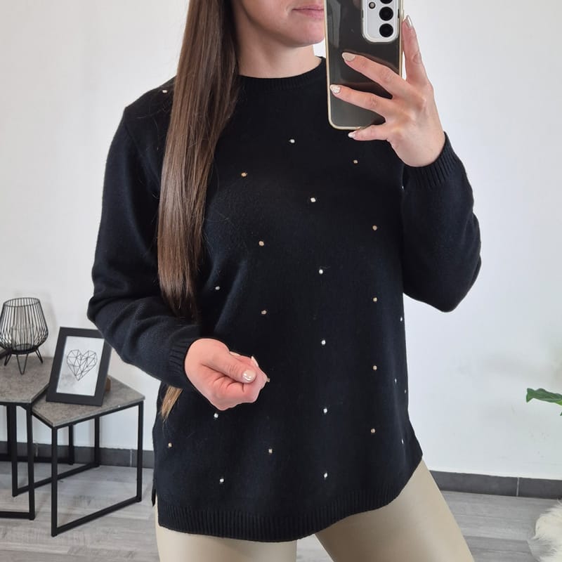 Ženska pletenina v črni barvi z barvnimi pikicami. Pletenino lahko nosite samostojno ali kot puloverček.