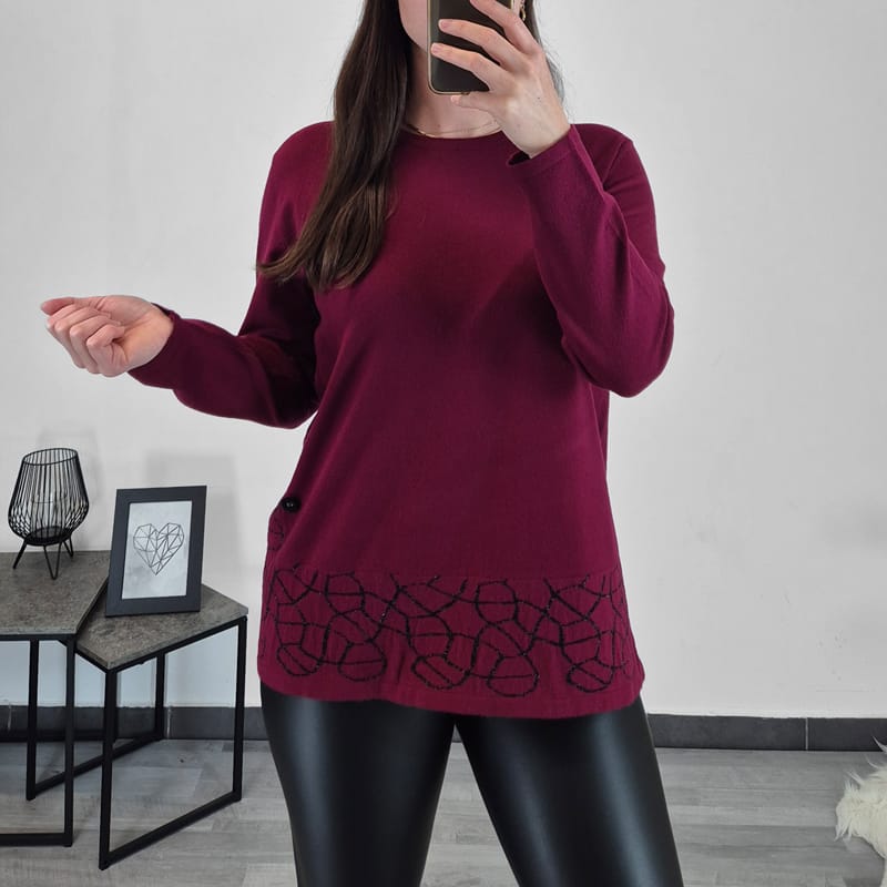 Ženska pletenina v bordo barvi. Pulover je izdelan iz mehkega in toplega materiala, mešanica viskoze in modala, zato je zelo prijeten za nošenje. Na prednji strani ga krasi vzorec s črnimi vijugami in dekorativnimi gumbi. Na voljo je v številkah M/L in XL/XXL.