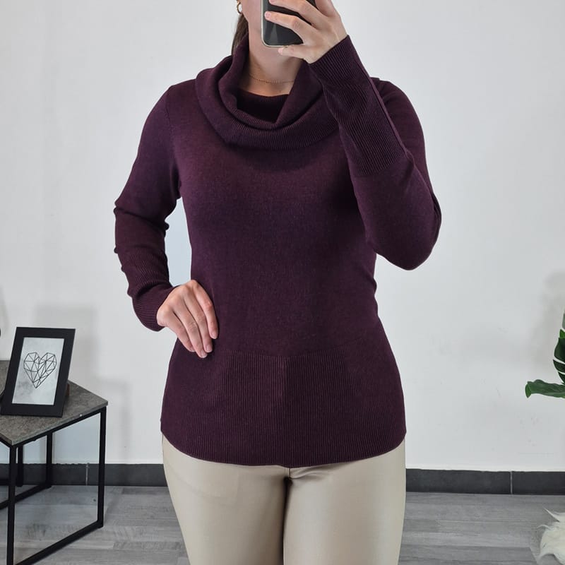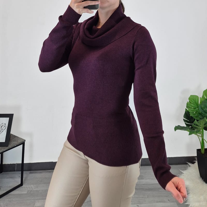 Ženska majica z bogatim visečim ovratnikom v bordo barvi. Izdelana je iz mešanice viskoze in najlona, je mehka na otip in je udobna za nošenje. Majica ima dolga rokava. Na voljo je od številke S do XXL.