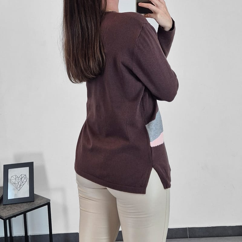Ženska pletenina v rjavi, sivi in roza barvi. Pulover je izdelan iz mešanica viskoze, zato je zelo prijeten za nošenje. Na prednji strani ga krasijo bleščice. Na voljo je v številkah M/L in XL/XXL.