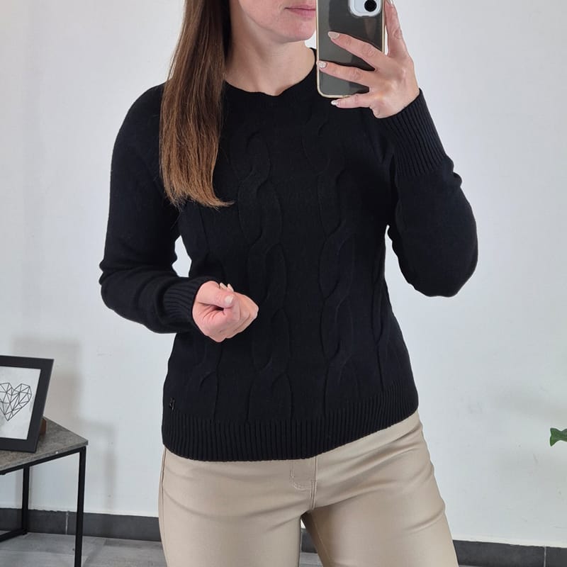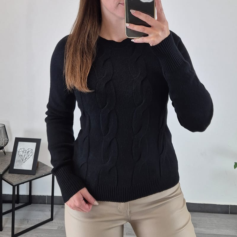 Ženska pletenina v črni barvi, na prednji strani ima vzorec. Pletenino lahko nosite samostojno ali kot puloverček. Je univerzalne velikosti in pokriva številke od S do L.