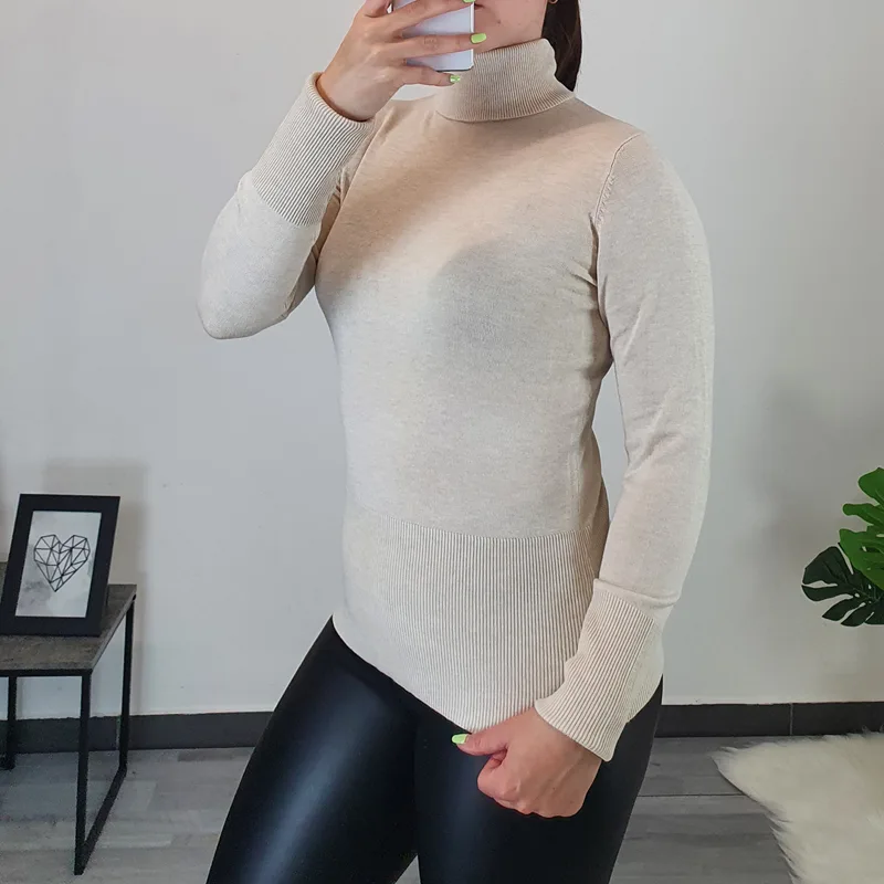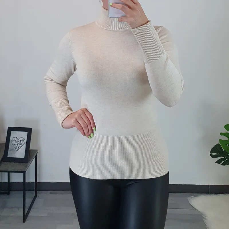 Ženski pleten puli v bež barvi. Izdelan je iz mešanice viskoze in najlona, je mehak na otip in je udoben za nošenje. Majica ima dolga rokava. Na voljo je od številke S do XXL.