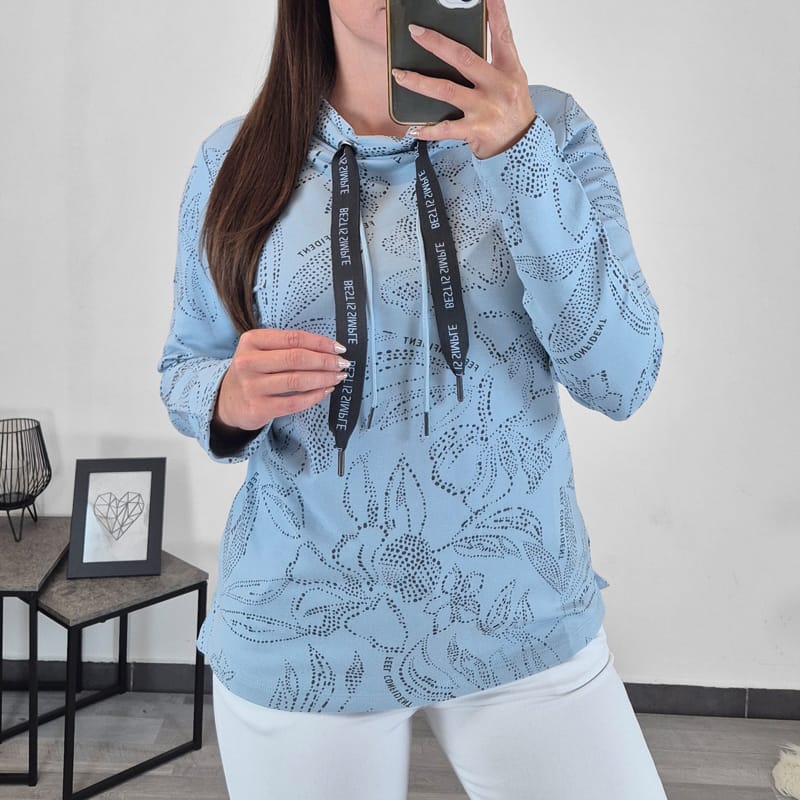 Modni ženski pulover modri barvi s sivim vzorčkom. Pulover ima dolga rokava. Ima visok ovratnik z vrvico in je brez kapuce. Pulover je ravnega kroja. Izdelan je iz mešanice modala, bombaža in elastana zato je zelo prijeten za nošenje.