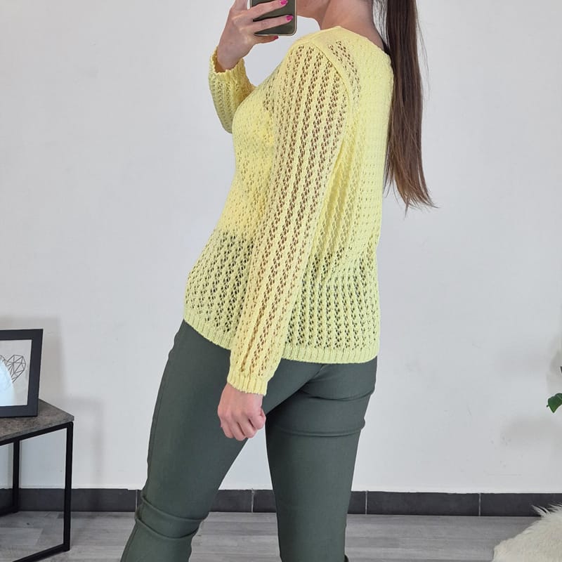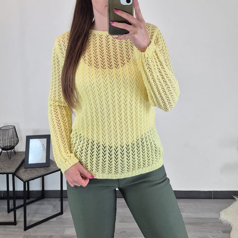 Tanka ženska pletenina v rumeni barvi, z dolgimi rokavi. Velikost je univerzalna, primerna za velikosti od S do L.