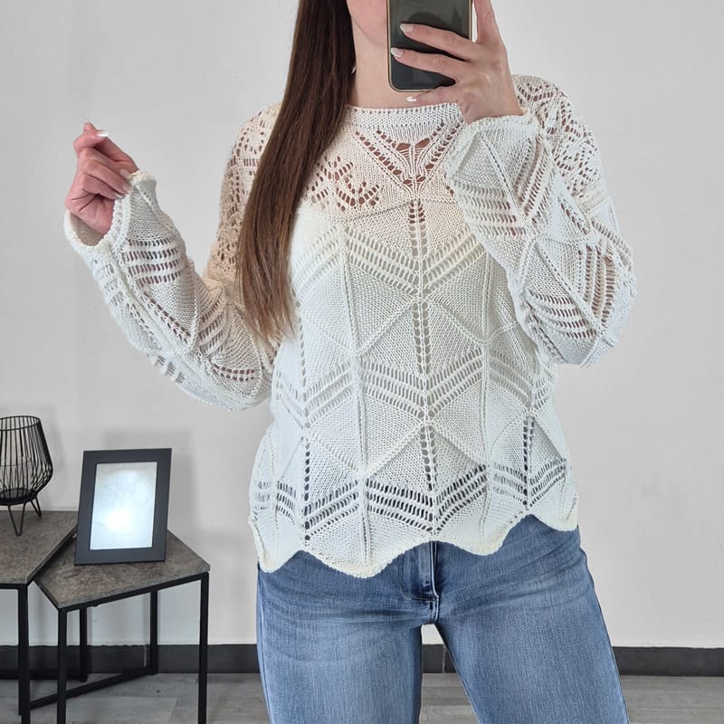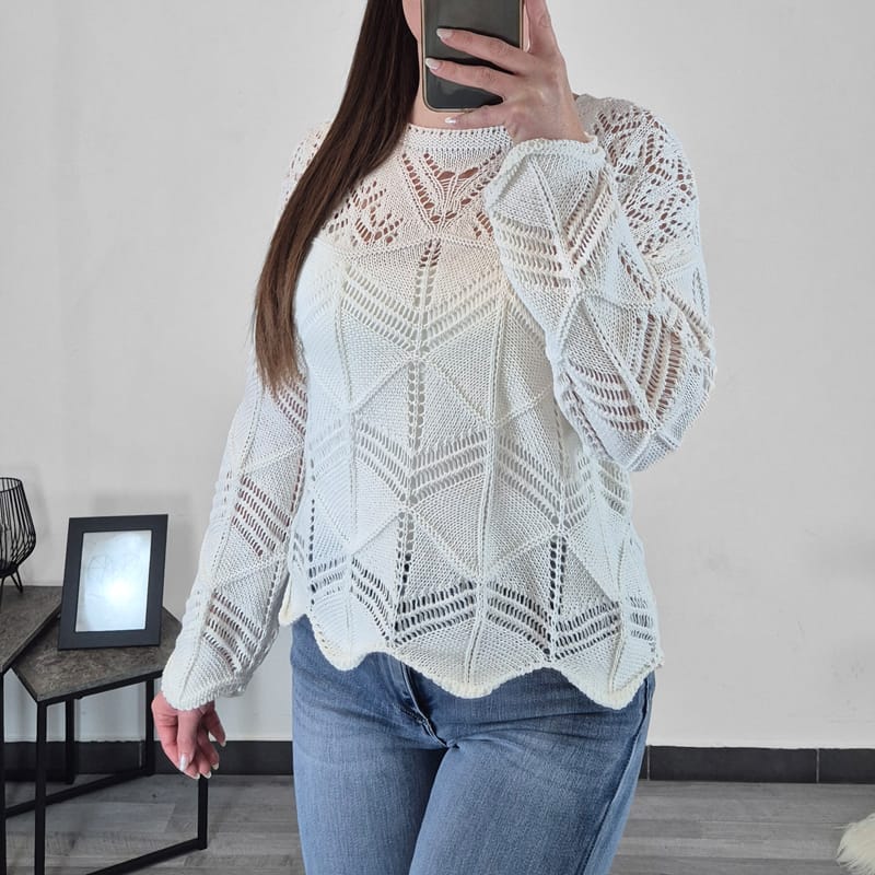 Tanka ženska pletenina v beli barvi, z dolgimi rokavi. Pletenina ima luknjičasti vzorec. Njena sestava je iz mešanice bombaža, zato je prijetna za nošenje. Je univerzalne velikosti, primerna za S do XL.