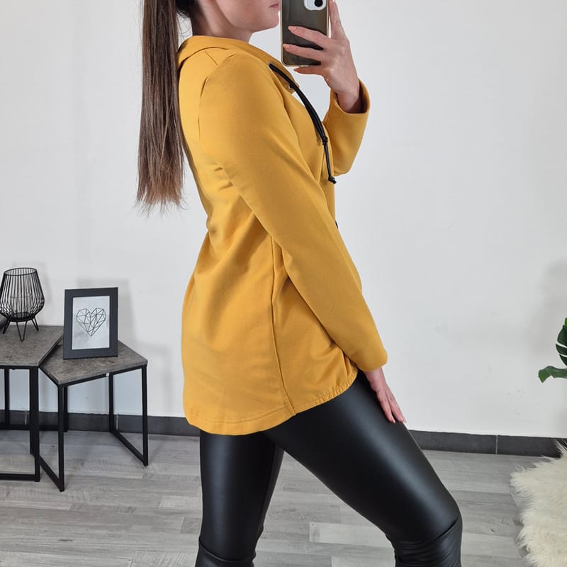 Športni pulover Lenča z širokim ovratnikom in dodano vrvico. Pulover je rumene barve, na sprednji strani ima izdelan motiv iz umetnega usnja. Zadnji del puloverja je krojen nekoliko daljše, spredaj pa je v rob prišita elastika. Izdelan je iz kvalitetnega bombaža in je prijeten za nošenje. Na voljo je od številke 38 do 48.