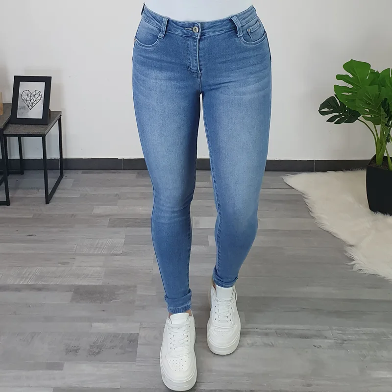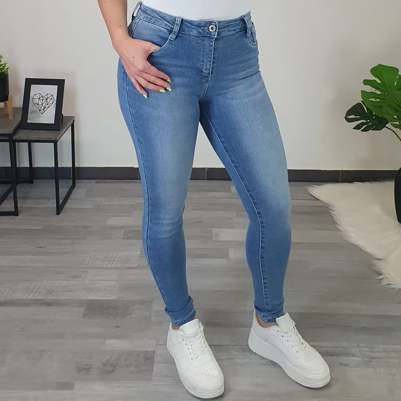 Ženske kavbojke v svetlejši jeans barvi. Kavbojke so zelo elastične ter udobne za nošenje, zadnji del hlač je oblikovan tako, da lepo poudari vašo postavo. Zapenjajo se z zadrgo in imajo dva žepa na sprednji strani in dva žepa na zadnji strani. Jeans hlače boste odlično kombinirale s svojimi najljubšimi oblačili.