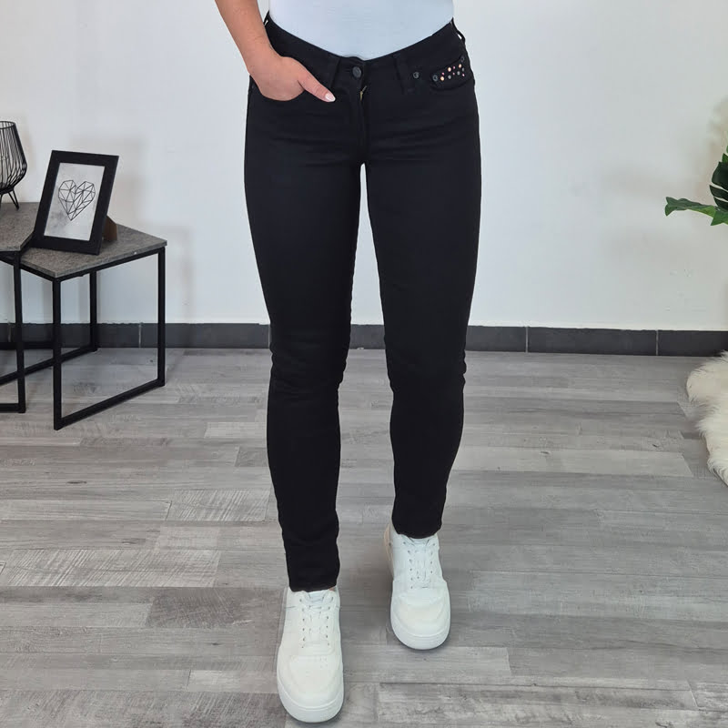 Scoch dolge hlače v črni barvi. So push up model, zadnji del hlač je oblikovan tako, da lepo poudari vašo postavo. Pas je nizek. Hlače imajo dva žepa spredaj in zadaj, ob žepih so dodani kamenčki. Hlačnice so v dolžini 32.
