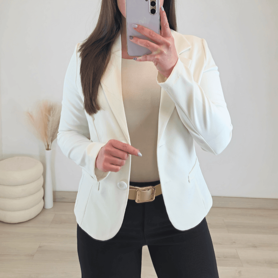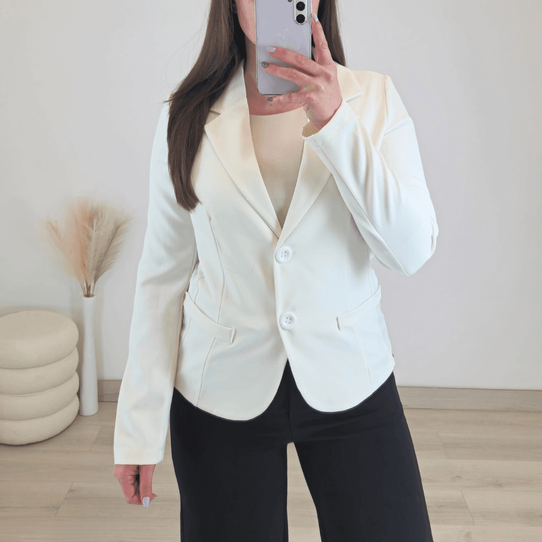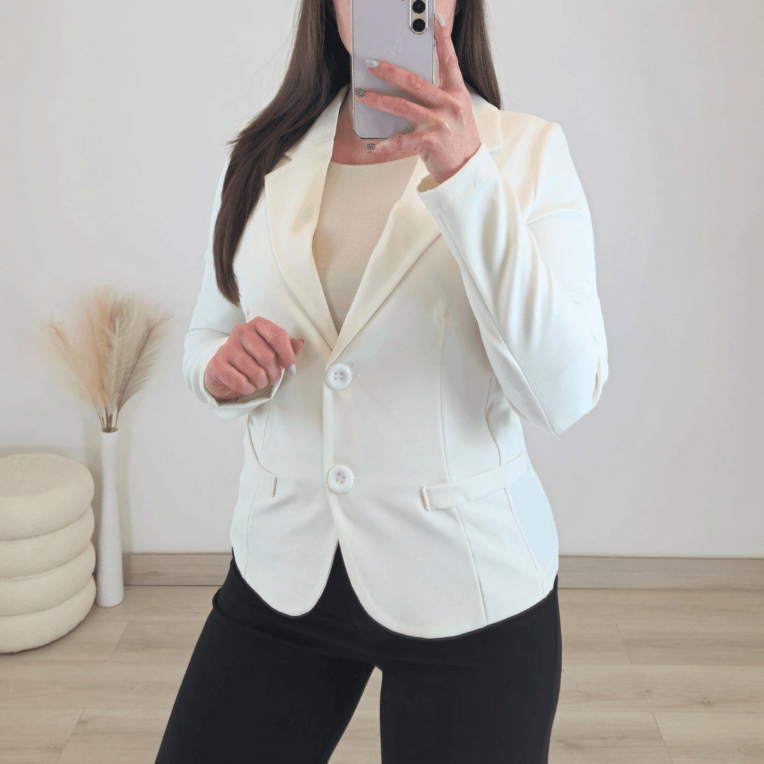 Modni ženski sako v smetana beli barvi. Ima dolga rokava in se zapenja na 2 gumba. Ramena niso podložena, je lepo krojen in teliran, ter lepo poudari vašo postavo.