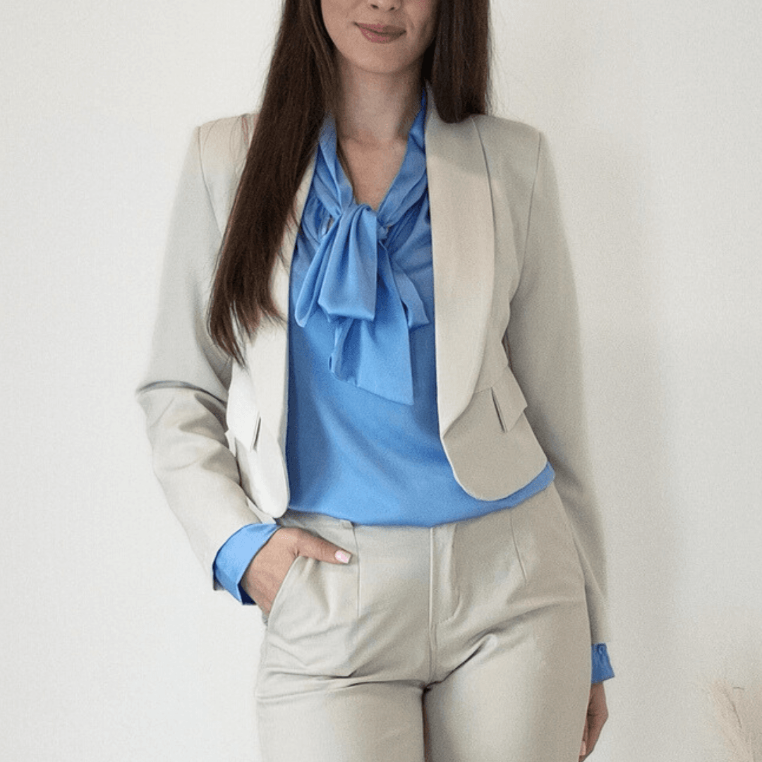 Moden ženski sako v svetlo bež barvi. Ima dolga rokava in ima dekorativne žepe. Ima rahlo podložena ramena. Velikost je univerzalna, ustreza velikosti S, M, L.