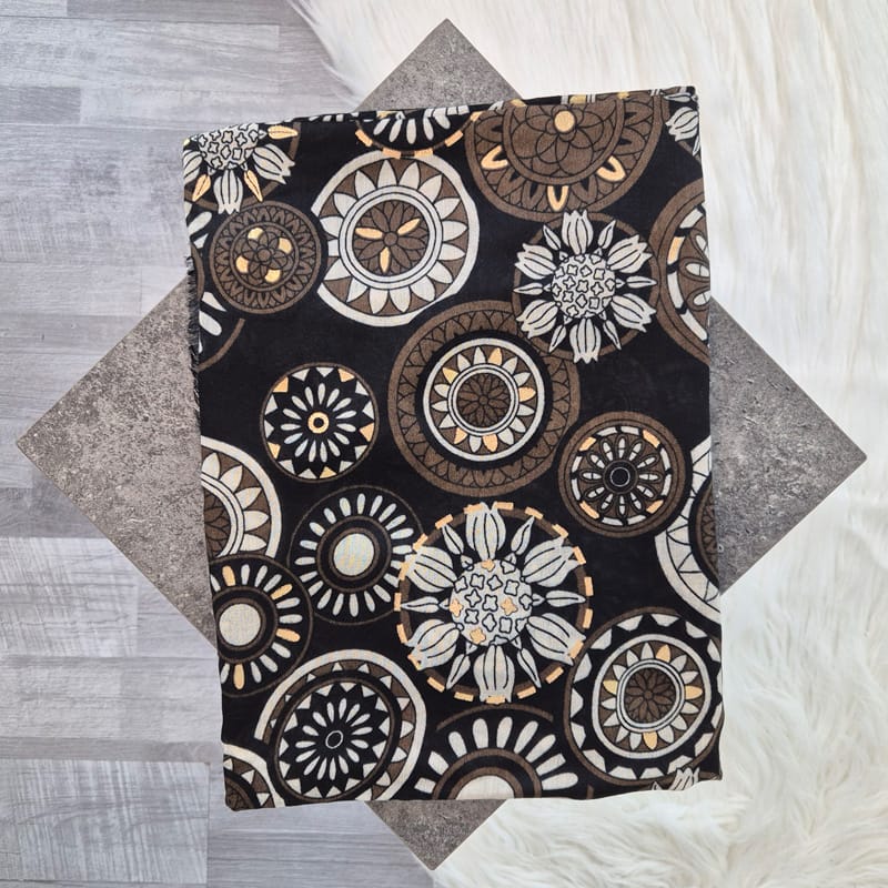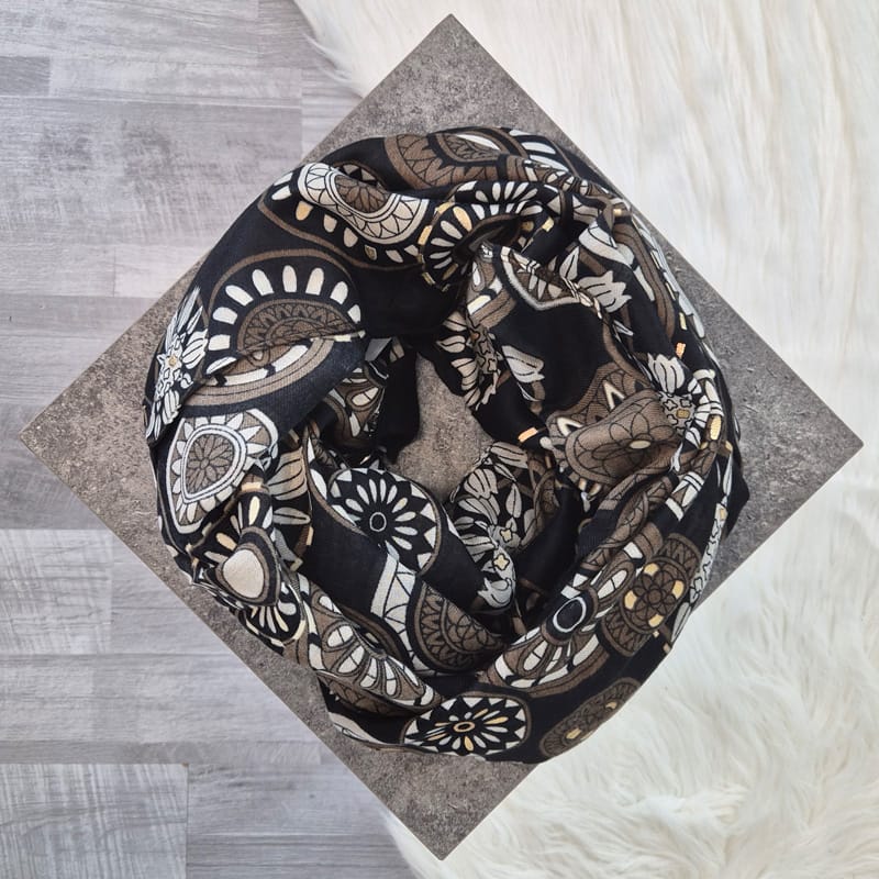 Šal s pisanim vzorcem v črni, bež, rjavi in zlati barvi. Narejen je iz viskoze in je mehak na otip.