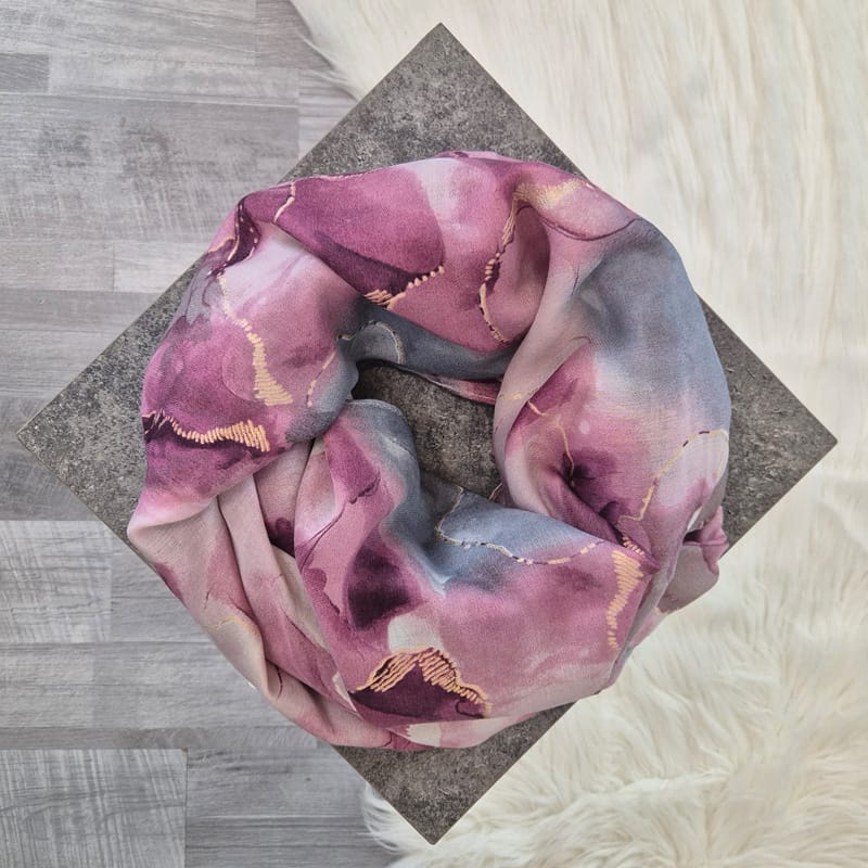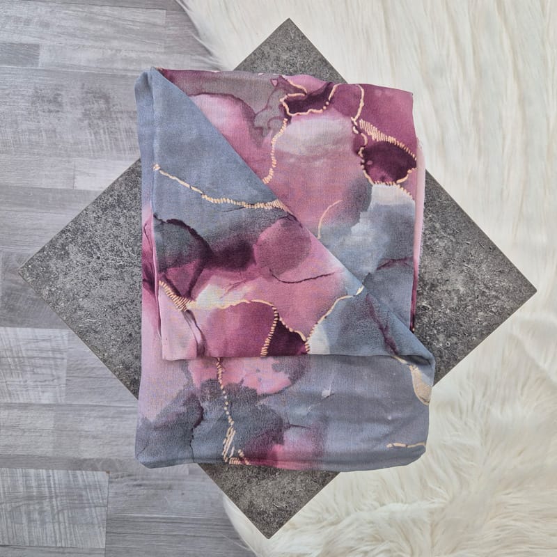 Šal s pisanim vzorcem v roza, sivi in zlati barvi. Narejen je iz viskoze in je mehak na otip.
