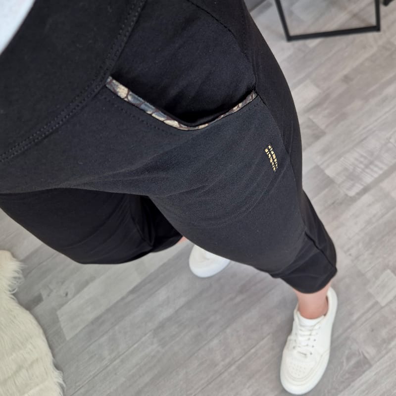 Športne hlače v črni barvi. Hlače imajo pas na elastiko, dva stranska žepa, hlačnice so oprijete in dolžine 3/4. Žepe krasijo trakovi v kombinaciji rjave in zlate barve. Izdelane so iz kvalitetnega bombaža in so udobne za nošenje.