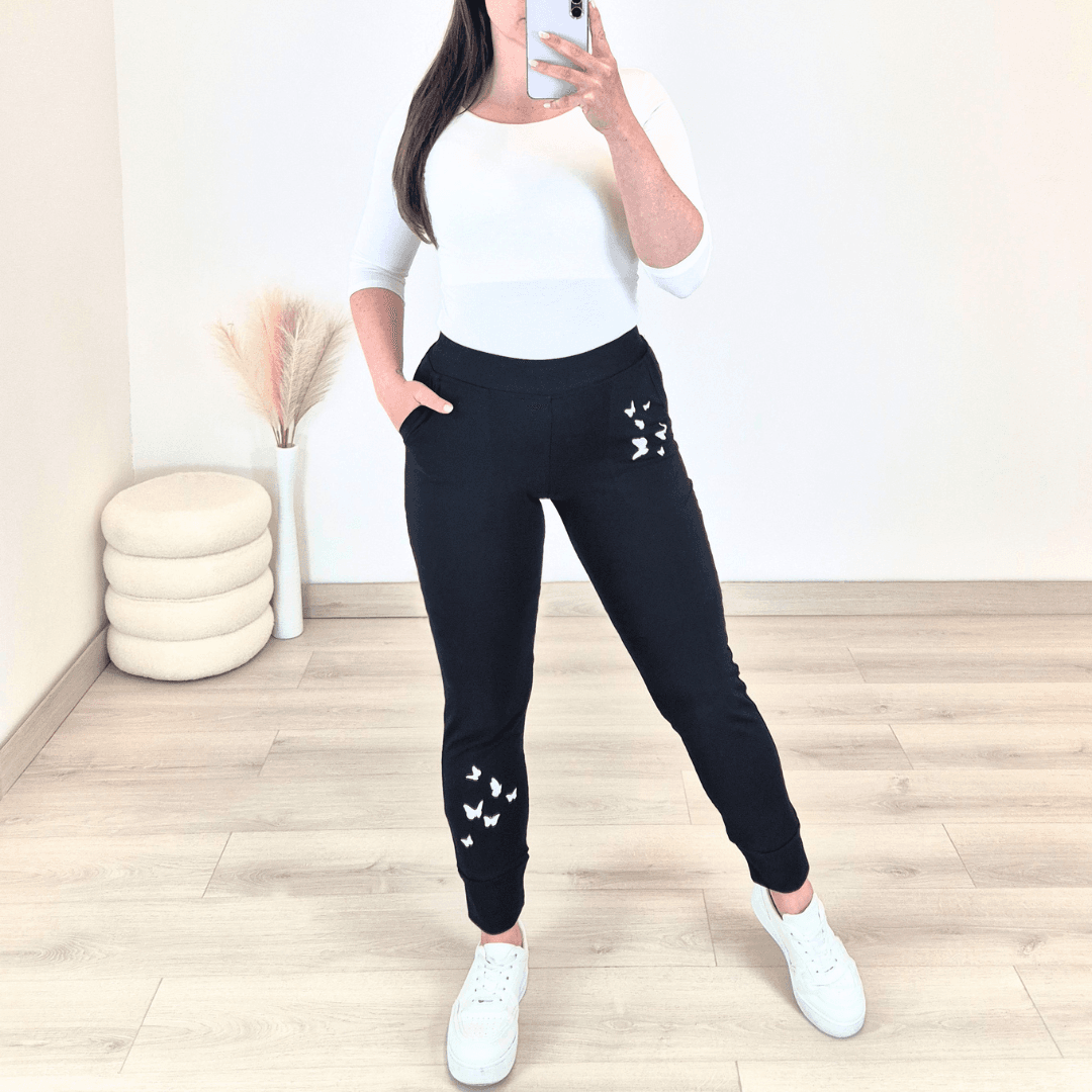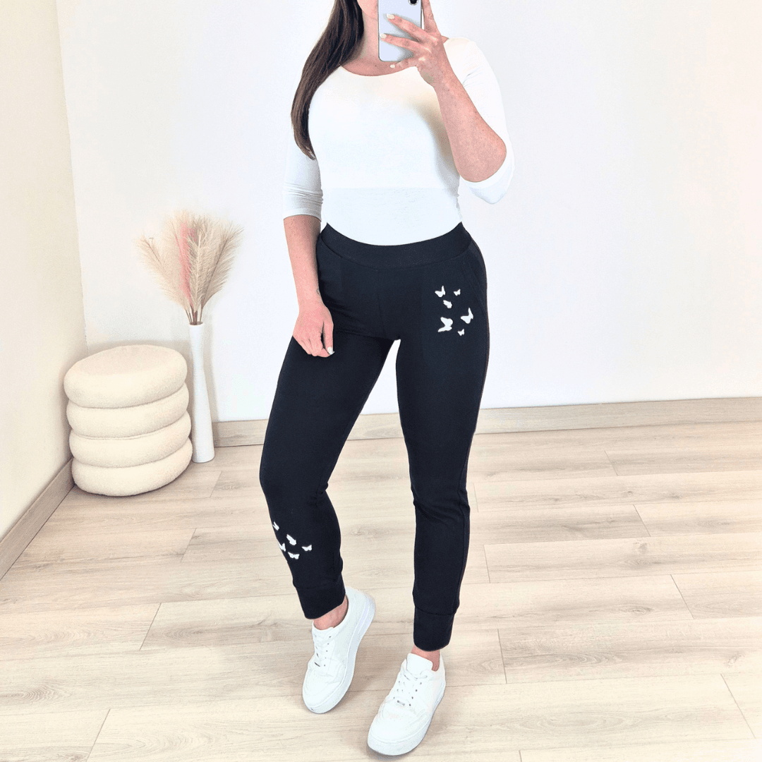 Bombažne športne hlače Anja v črni barvi. Hlače imajo višji pas na elastiko, dva stranska žepa, hlačnice so dolge , zaključijo se s patentom. Ob žepu in ob patentu jih krasi čudovit bel tisk. Izdelane so iz kvalitetnega bombaža in pri nošenju ohranjajo svojo obliko. Na voljo so od številke 36 do 50.
