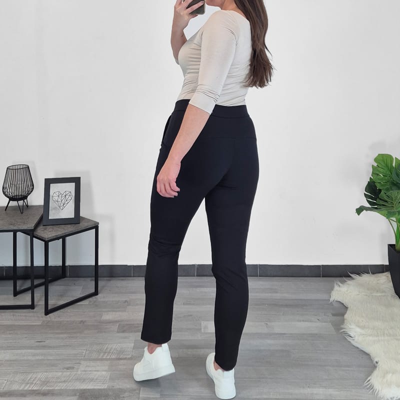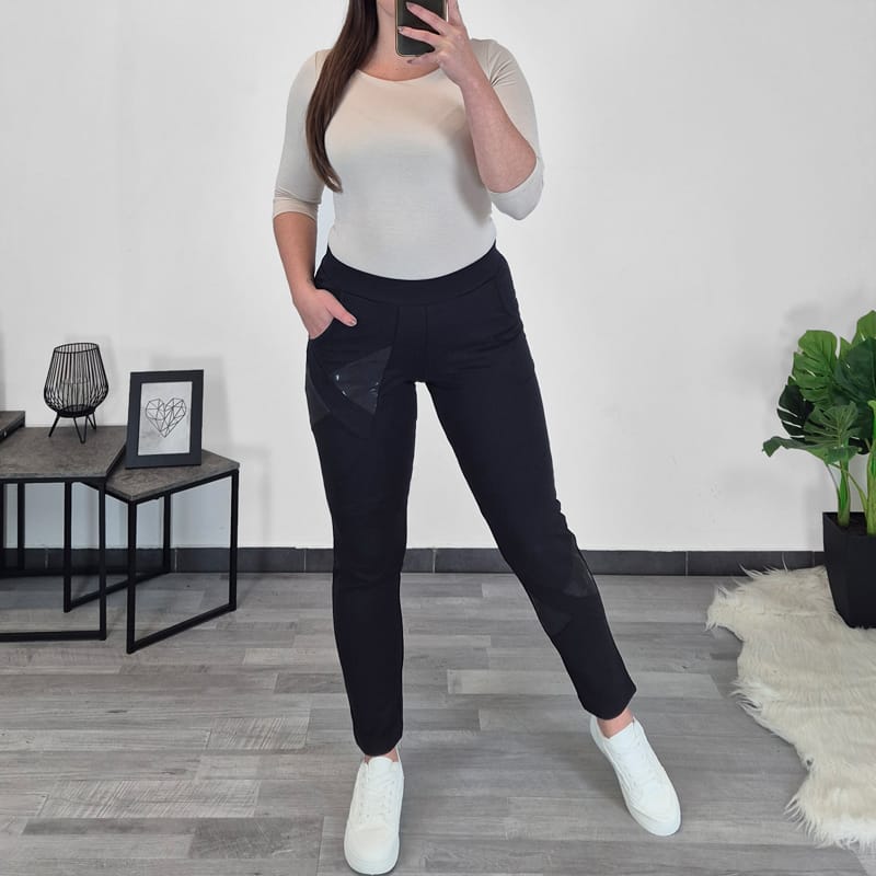 Modne športne hlače Ives v črni barvi v kombinaciji z umetnim usnjem. Hlače imajo srednje visok pas z elastiko, hlačnice so dolge in oprijete. Imajo dva stranska žepa. Izdelane so iz kvalitetnega bombaža in so prijetne za nošenje. Priporočamo nakup večje številke.