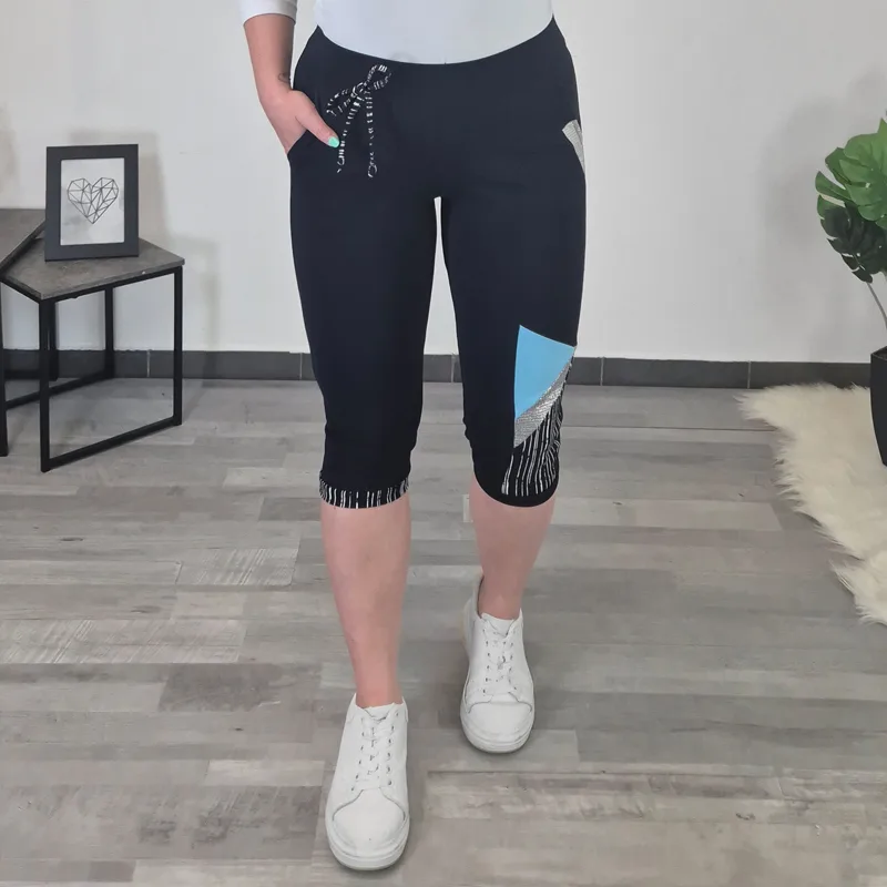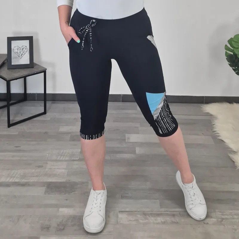 Modne bombažne hlače Tala v temno modri barvi. Hlače imajo višji pas, dva stranska žepa, hlačnice so oprijete in 3/4 dolžine. Hlače so kombinirane s potiskano, turkizno modro in srebrno tkanino. Izdelane so iz kvalitetnega bombaža, ki ob nošenju ohranja svojo obliko. Na voljo so od številke 36 d0 52.