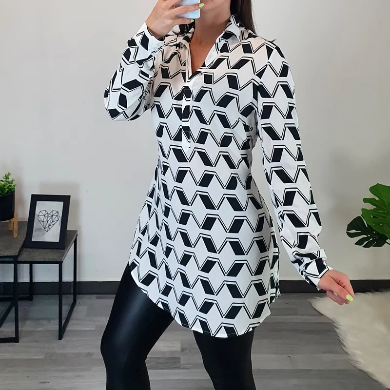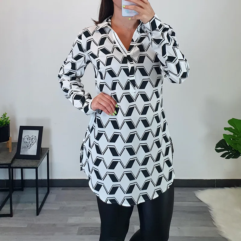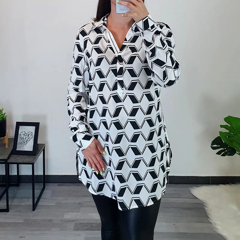 Ženska srajca znamke Kenny S. v beli barvi s črnim vzorcem. Srajca je izdelana iz kvalitetne viskoze, je lahka in zračna. Ima ovratnik, dekolte je krojen na V. Na voljo je od številke 36 do 46.