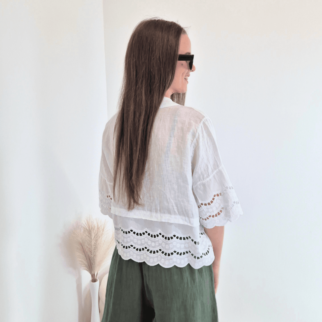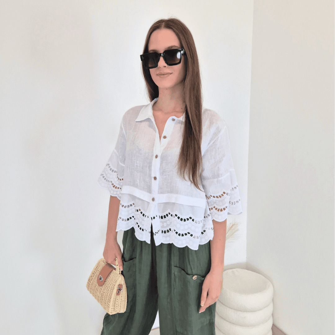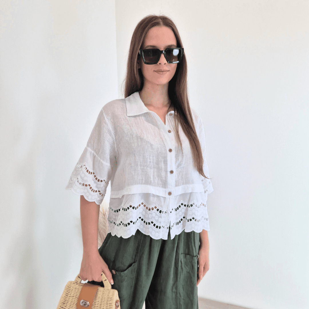 Modna ženska srajca iz kolekcije Lanna v bela barvi. Srajca ima ovratnik, zapenja se z gumbi. Rokava so široka in dolžine 3/4. Na rokavih in na spodnjem delu jo krasi čipka. Izdelana je iz 100% lanu, zato je odlična izbira za vroče dni. Velikost je univerzalna, primerna za S do XL. Vse kose iz kolekcije Lanna lahko med sabo lepo kombinirate.