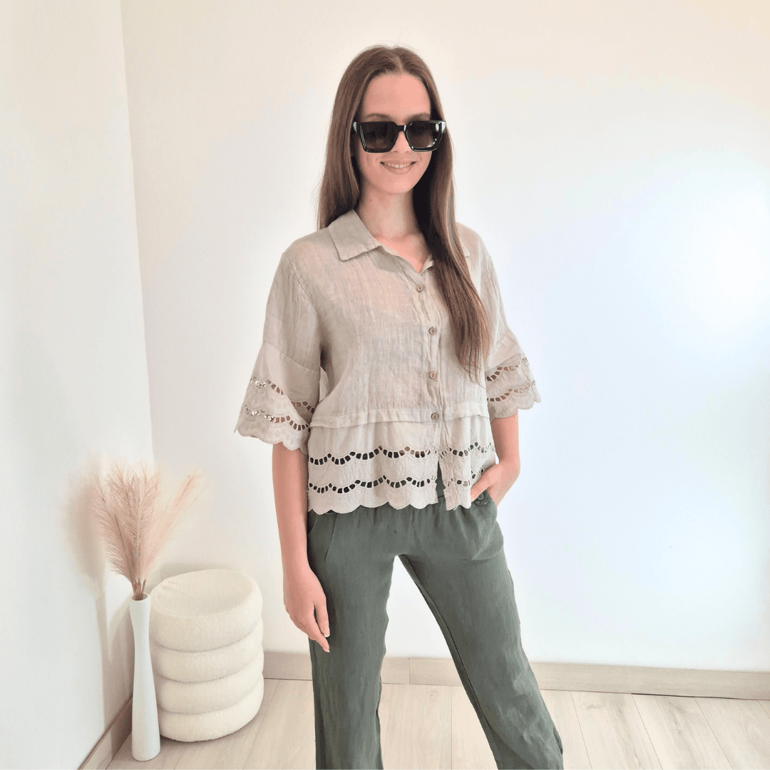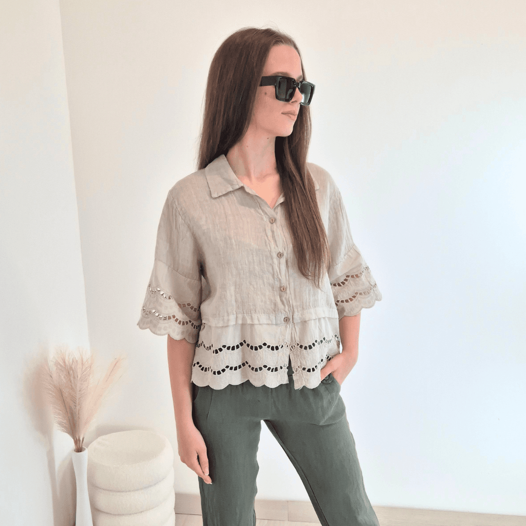 Modna ženska srajca iz kolekcije Lanna v bež barvi. Srajca ima ovratnik, zapenja se z gumbi. Rokava so široka in dolžine 3/4. Na rokavih in na spodnjem delu jo krasi čipka. Izdelana je iz 100% lanu, zato je odlična izbira za vroče dni. Velikost je univerzalna, primerna za S do XL. Vse kose iz kolekcije Lanna lahko med sabo lepo kombinirate.