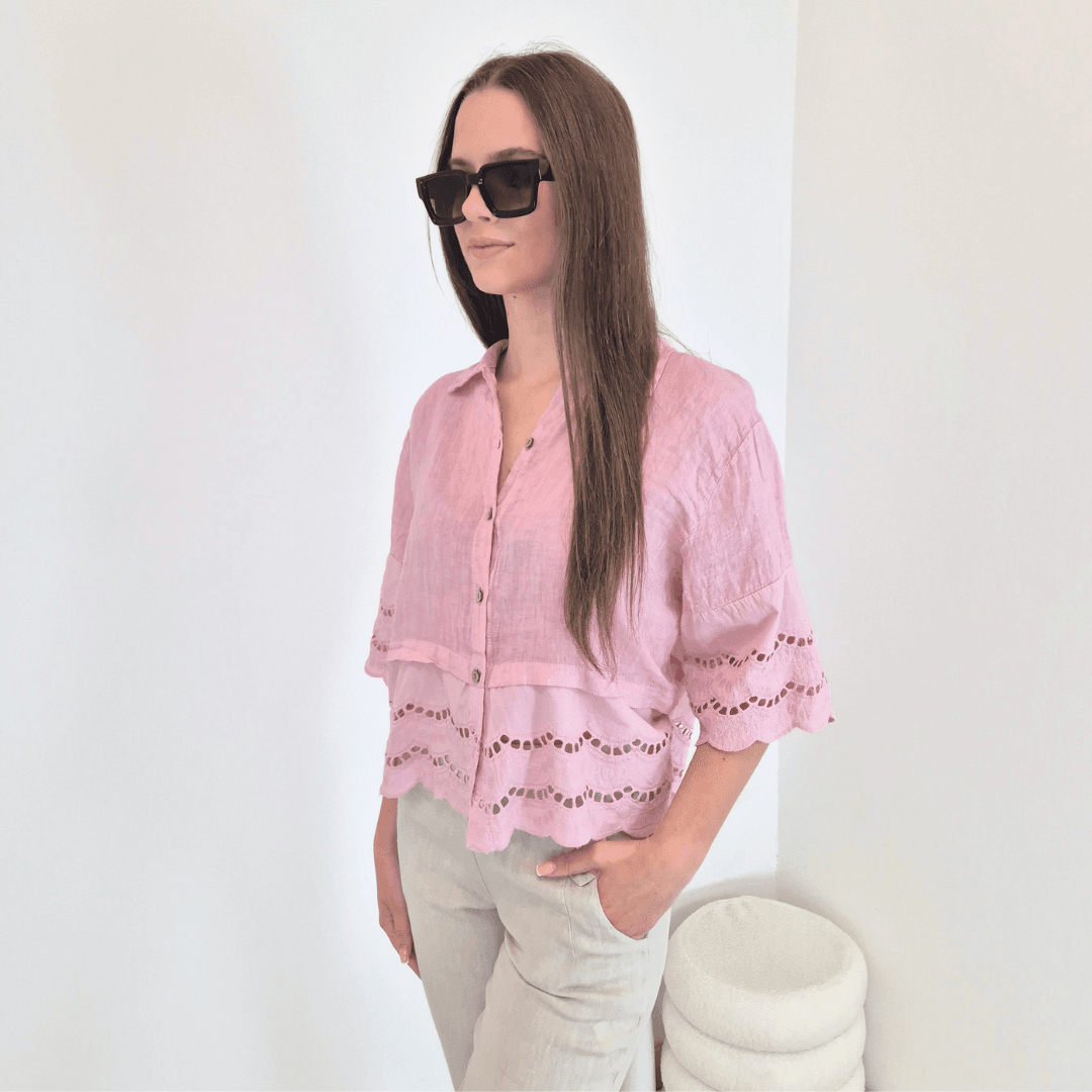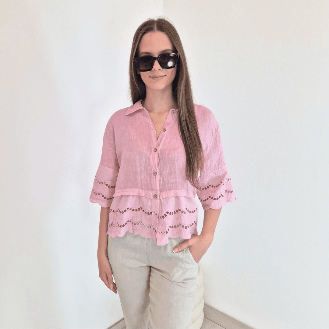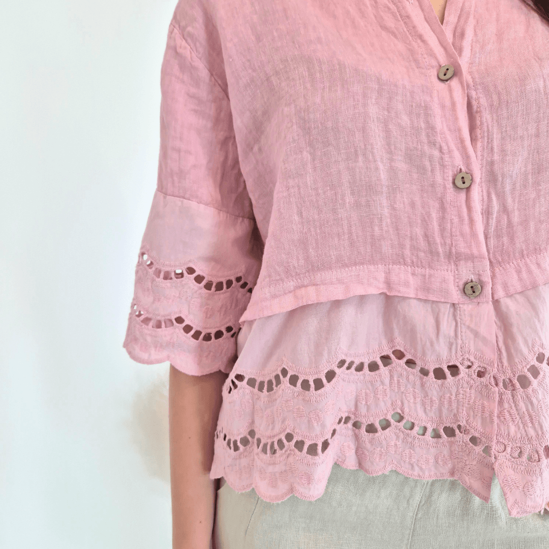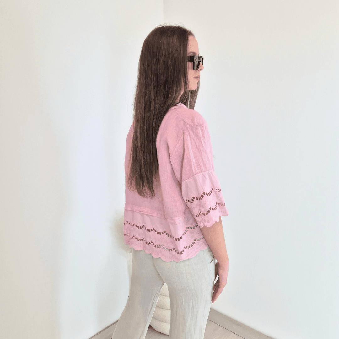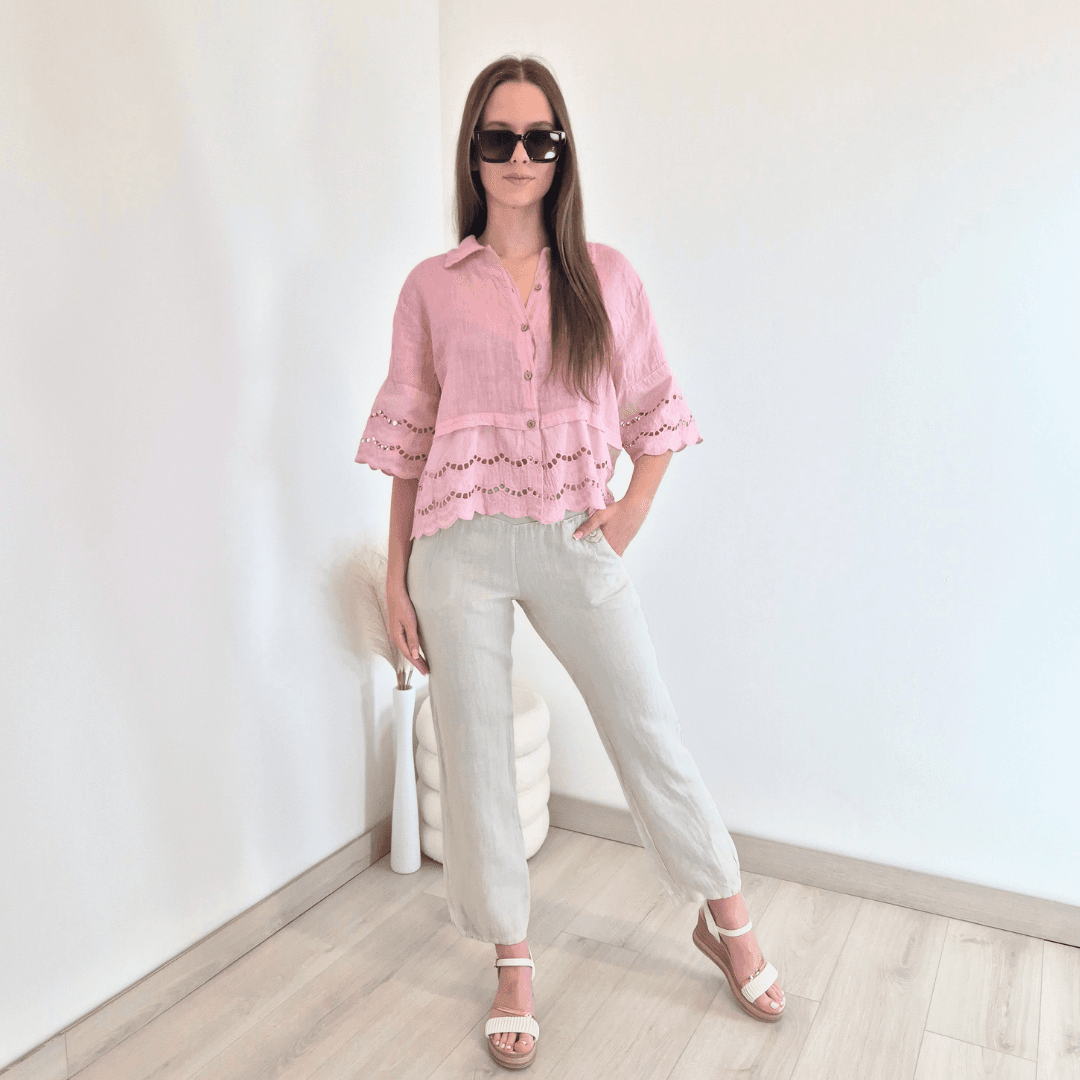 Modna ženska srajca iz kolekcije Lanna v roza barvi. Srajca ima ovratnik, zapenja se z gumbi. Rokava so široka in dolžine 3/4. Na rokavih in na spodnjem delu jo krasi čipka. Izdelana je iz 100% lanu, zato je odlična izbira za vroče dni. Velikost je univerzalna, primerna za S do XL. Vse kose iz kolekcije Lanna lahko med sabo lepo kombinirate.