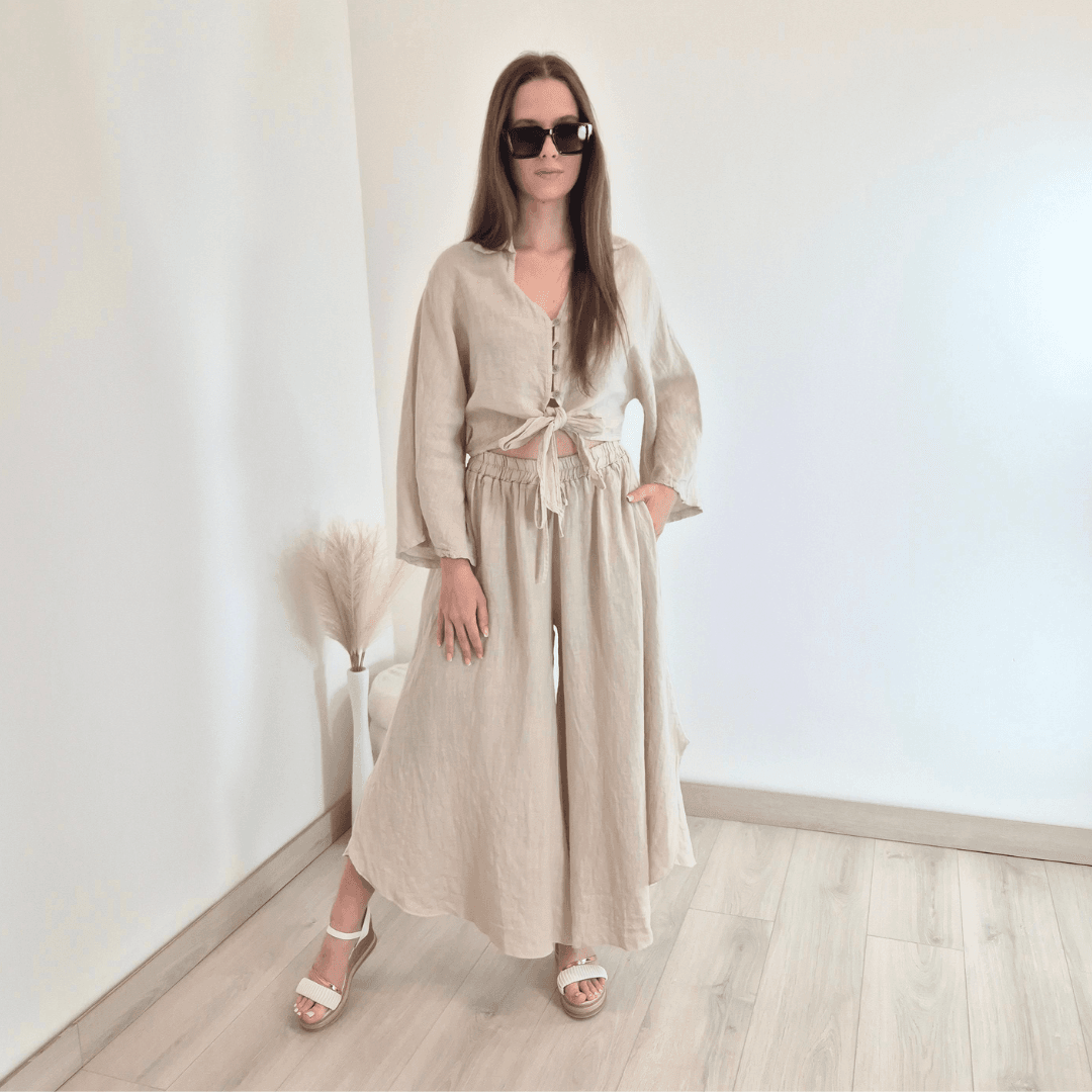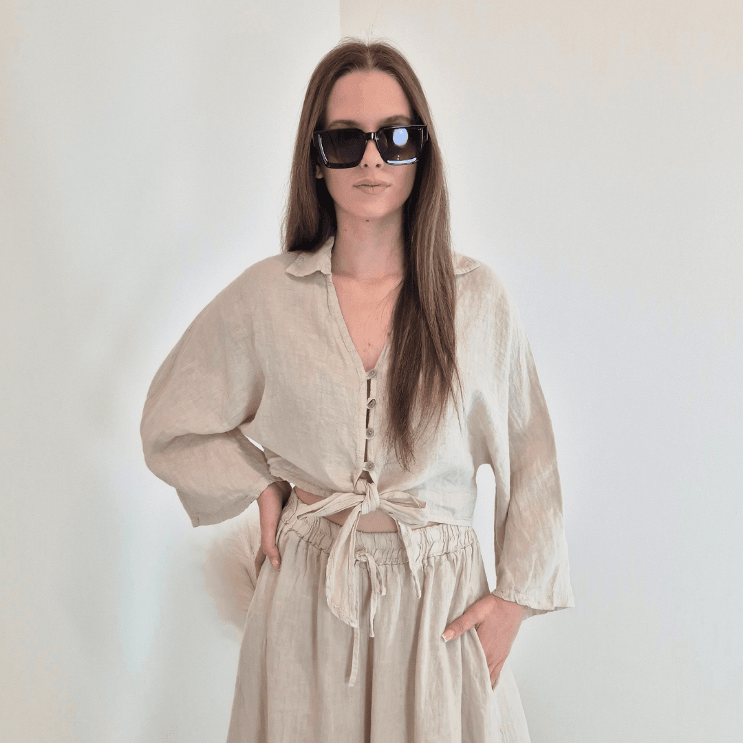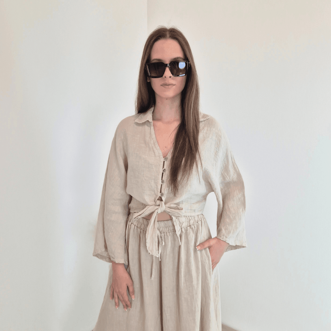 Modna ženska srajca iz kolekcije Lanna v bež barvi. Srajca ima ovratnik, V-izrez, rokava so široka in dolžine 7/8. Na sprednji strani se zapenja z gumbi in se zaveže. Izdelana je iz 100% lanu, zato je odlična izbira za vroče dni. Velikost je univerzalna, primerna za S do XL. Vse kose iz kolekcije Lanna lahko med sabo lepo kombinirate.