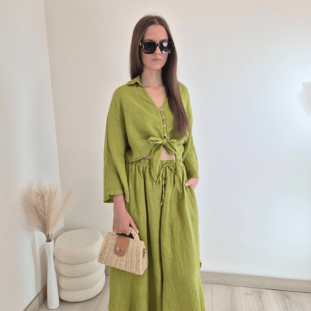 Modna ženska srajca iz kolekcije Lanna v zeleni barvi. Srajca ima ovratnik, V-izrez, rokava so široka in dolžine 7/8. Na sprednji strani se zapenja z gumbi in se zaveže. Izdelana je iz 100% lanu, zato je odlična izbira za vroče dni. Velikost je univerzalna, primerna za S do XL. Vse kose iz kolekcije Lanna lahko med sabo lepo kombinirate.