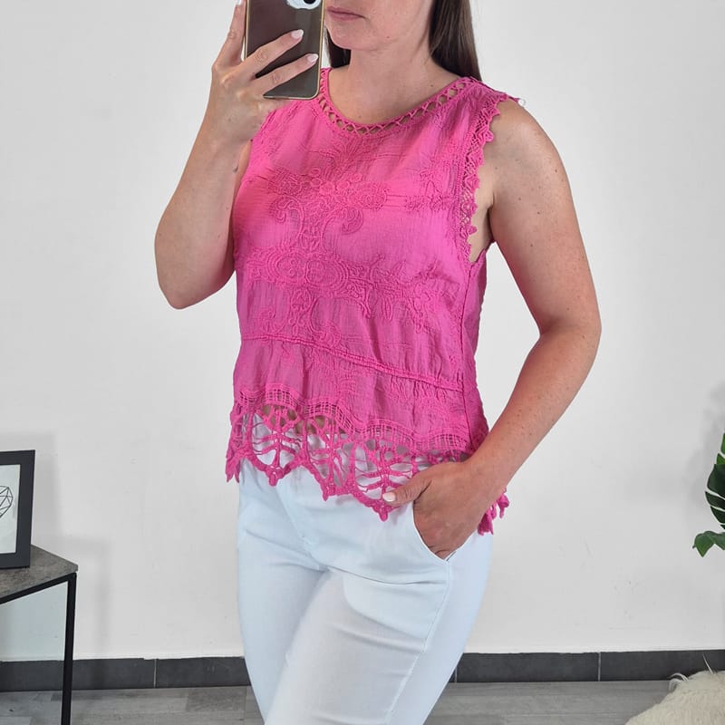 Krajša ženska majica brez rokavov v roza barvi. Top je izdelan iz 100% bombaža, v kombinaciji z vezenjem in čipko. Top je tanek in lahek, prijeten za nošenje tudi v vročih poletnih dneh. Velikost je univerzalna od S do L.