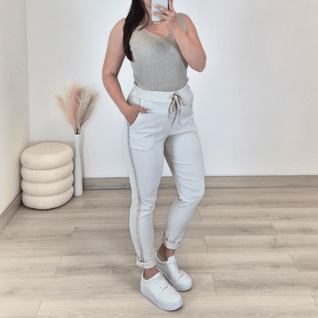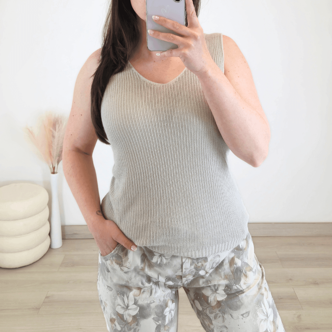Modna ženska majica brez rokav v bež barvi. Top je izdelan iz tanke pletenine iz 100% viskoze in je odlična izbira za poletne dni. Velikost je univerzalna, primerna za S do L.