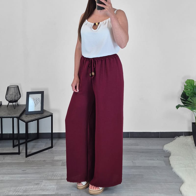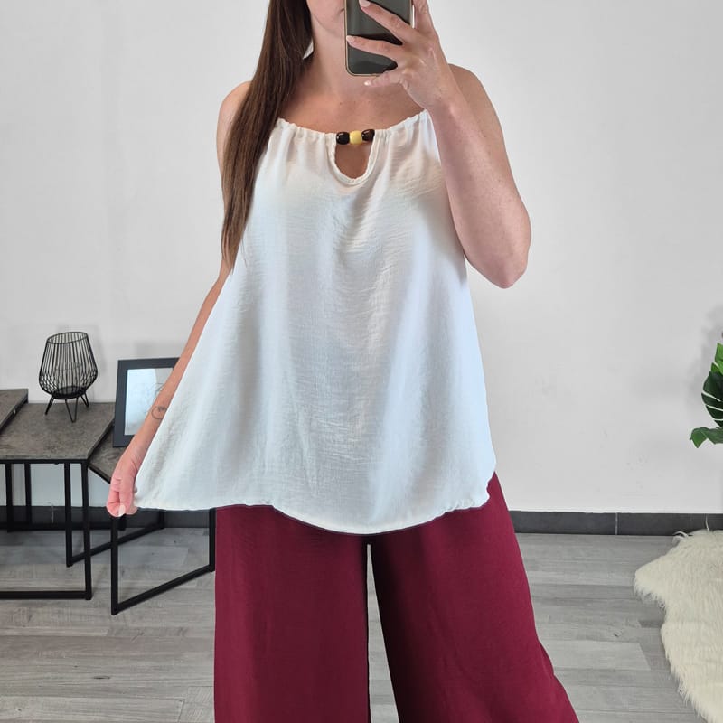 Poletni ženski top z ozkimi naramnicami. Top je v beli barvi, dodan ima lesneni obroček, ki daje topu posebno zanimiv izgled. Velikost je univerzalna, od M do XL. Top se odlično poda h hlačam 979604.