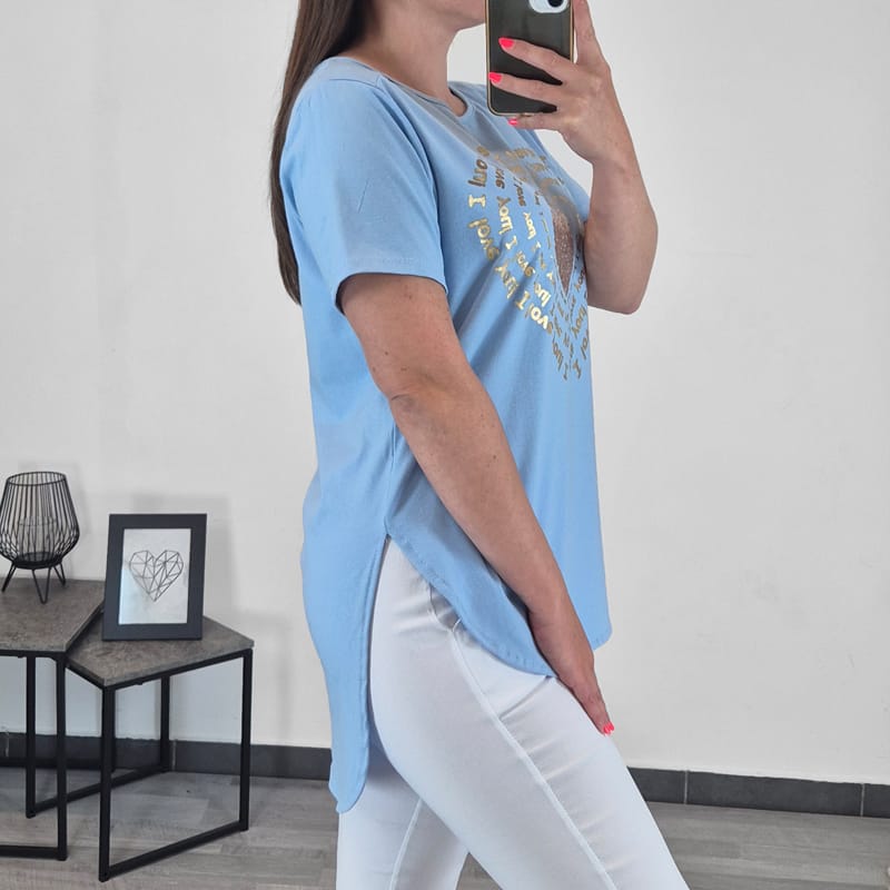 Ženska krajša tunika oz daljša majica v svetlo modri barvi. Tunika ima kratka rokava, zadaj je podaljšana, dodan je tisk srca in napisa v zlati barvi. Izdelana je iz bombaža, je mehka in zračna. Velikost je univerzalna, primerna za velikosti od S do L.