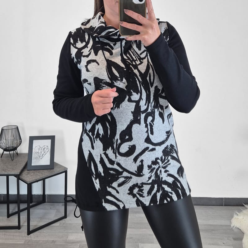 Ženska tunika Arja je narejena iz blaga črne barve, na sprednji strani jo krasi blago z vzorcem. Tunika ima viseč ovratnik s trakom, ki ga lahko poljubno zavežete. Ima dolga rokava, na spodnjem delu pa je dodana vrvica s katero lahko tuniko oblikujete.
