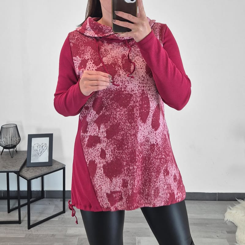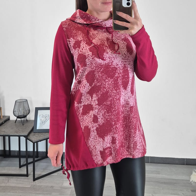Ženska tunika Arja je narejena iz blaga rdeče barve, na sprednji strani jo krasi blago z vzorcem. Tunika ima viseč ovratnik s trakom, ki ga lahko poljubno zavežete. Ima dolga rokava, na spodnjem delu pa je dodana vrvica s katero lahko tuniko oblikujete.