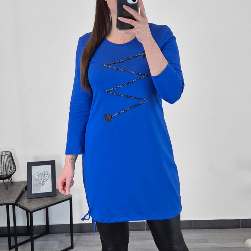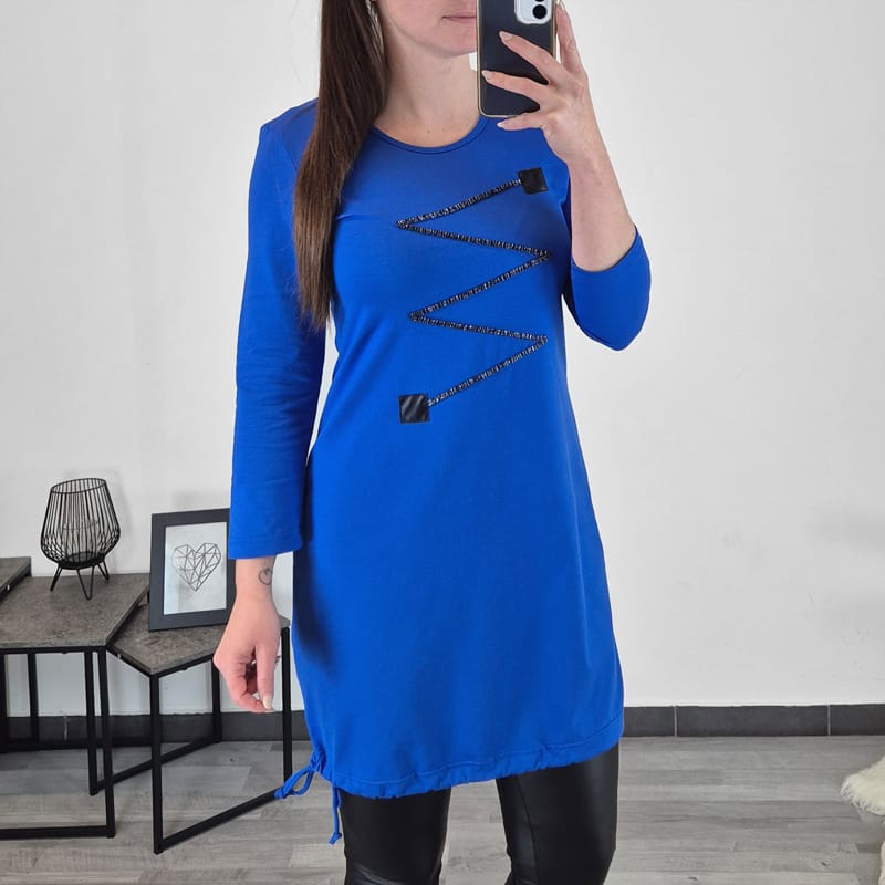 Modna bombažna tunika Arza v pariško modri barvi. Tunika je izdelana iz kvalitetne mešanice bombaža in elastana, ter se lepo prilagaja telesu. Ima 3/4 rokava. Tunika je krojena na ‘balon’, na koncu je dodana vrvica, s katero tuniko oblikujete po svoji postavi. Na sprednji strani jo krasi prišiti trak.