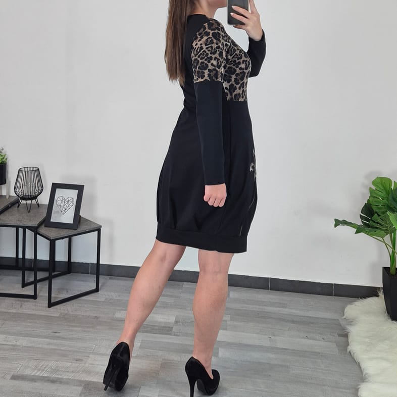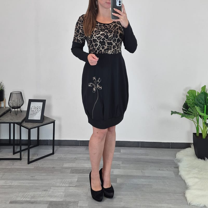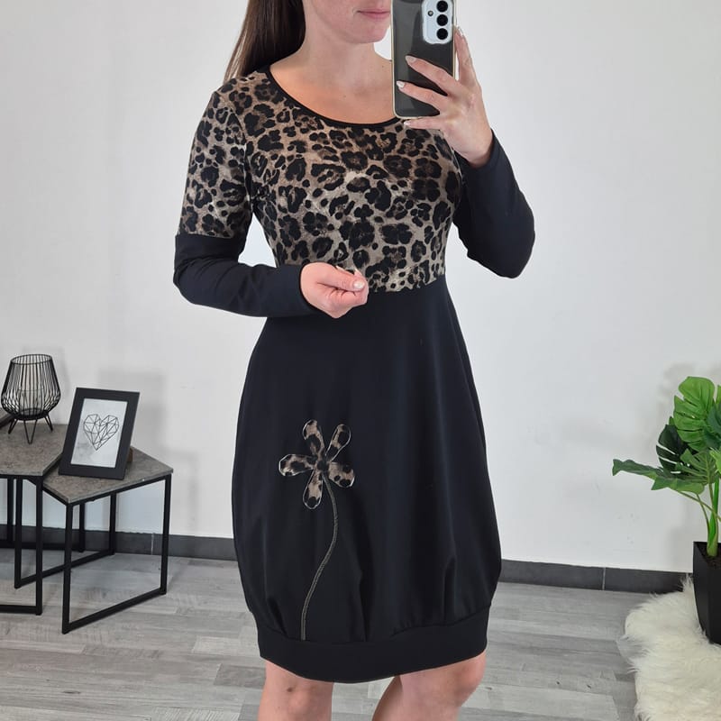 Bombažna tunika Azelea v črni barvi s kombinacijo tigrastega vzorca tkanine. Tunika je izdelana iz kvalitetne mešanice bombaža in elastana, ter se lepo prilagaja telesu. Tunika je krojena na ‘balon’, na koncu je dodan patent. Na sprednji strani ima prišito blago v obliki cvetlice. Kroj tunike je primeren za vse postave, tudi za močnejše, saj je na voljo do številke 50.