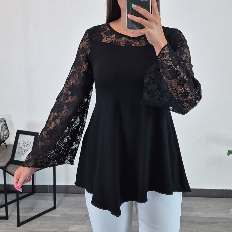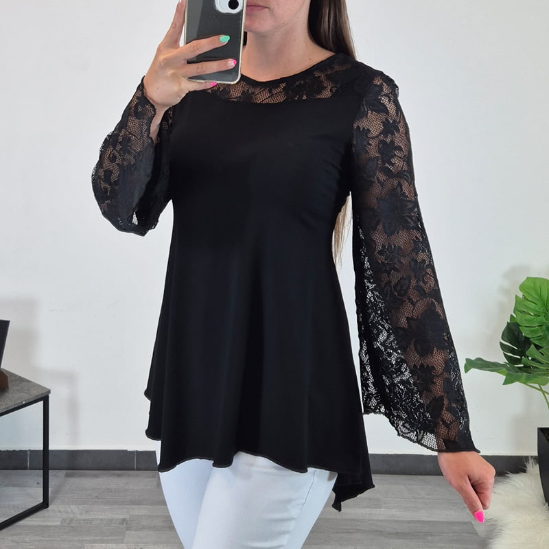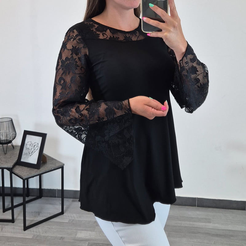 Ženska tunika s 3/4 rokavi. Tunika je narejena iz viskoze, je asimetrična in krojena na ‘A’, kar pomeni, da je v prsih širša in spodaj širša. Tunika ima čipkasta široka rokava, zaradi česar izgleda elegantno.