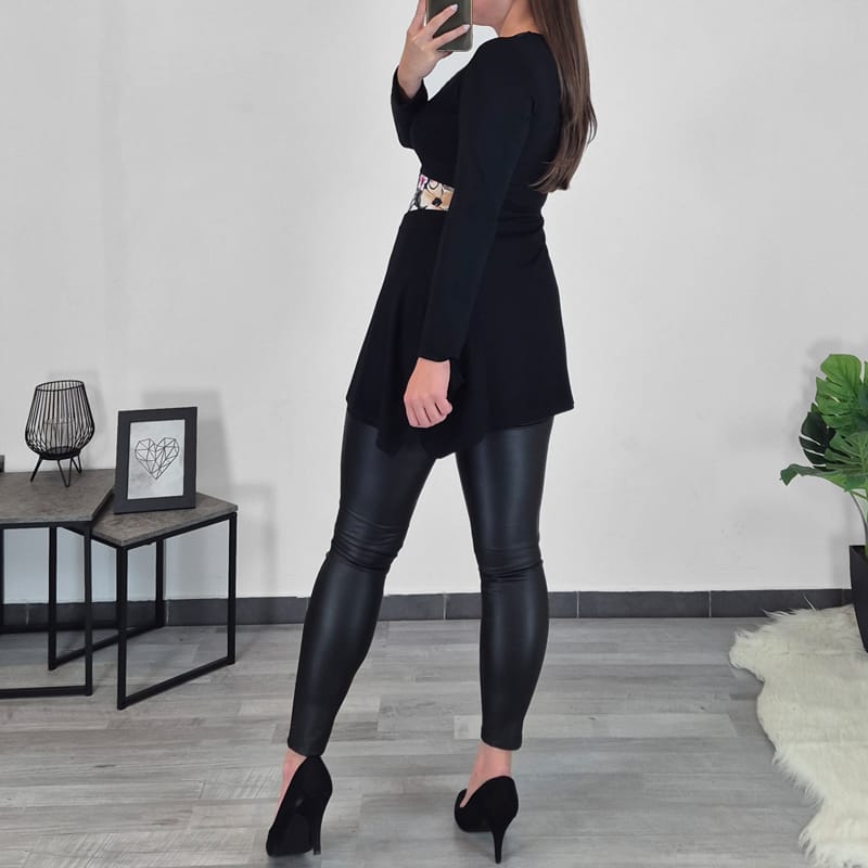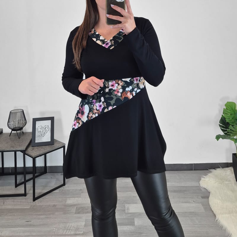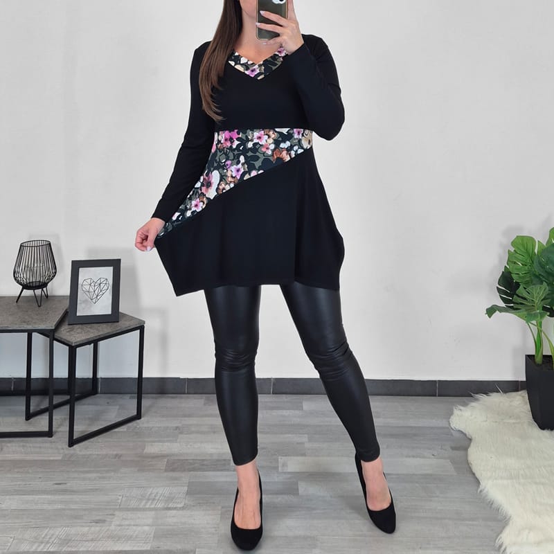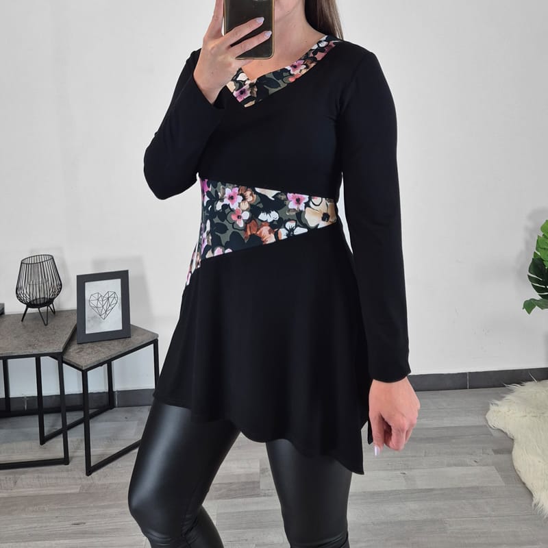Tunika Janja je narejena iz viskoze, je elastična in udobna. Tunika ima dolga rokava, je asimetričnega kroja in lepo pade. Je v črni barvi, kombinirana s pisanim cvetličnim vzorcem.